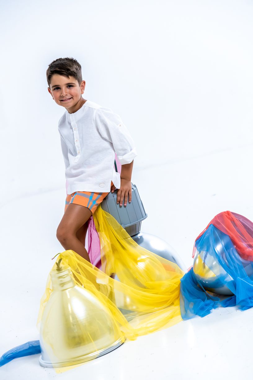 White linen shirt with round neck and 3 buttons. It has a button at the elbow to be able to roll up the sleeves. Tangerine and blue poplin pants. Very original.
