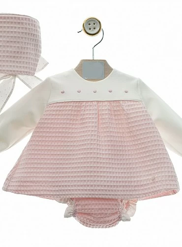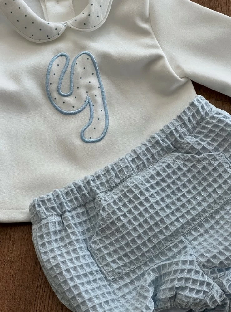 Ecru t-shirt with collar and embroidery in powder blue polka dots to match the padded piqué bloomer