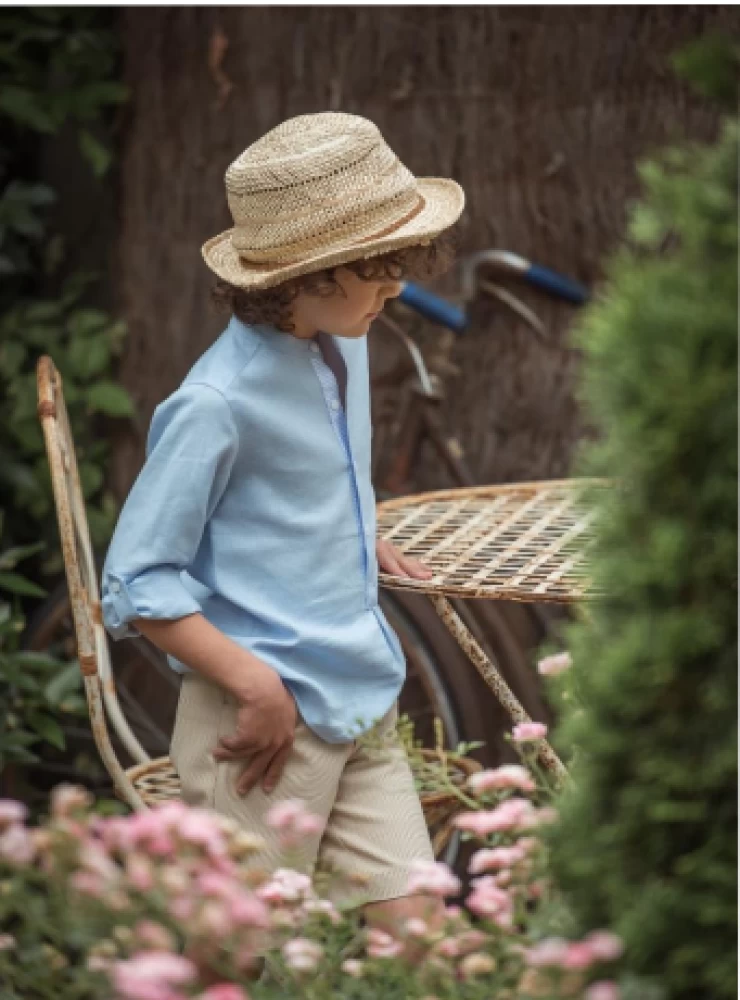 Powder blue cotton shirt. It has a mandarin collar and long sleeves that can be rolled up and tied at the elbow. He wears camel colored pants. Made in Spain