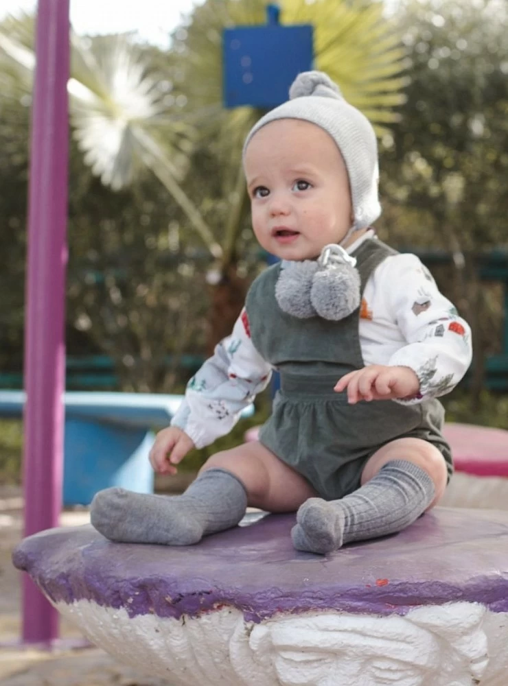 Overalls in moss green with fine corduroy and an ecru bottom blouse with a little house print and a baby collar.