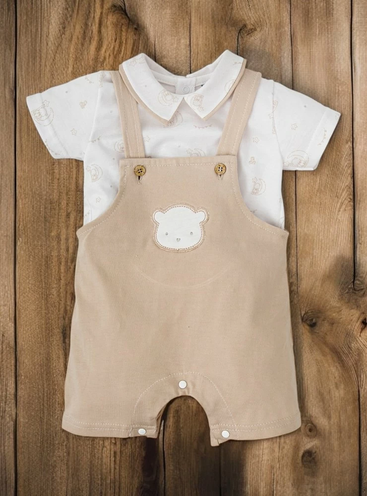 100% cotton overalls and blouse. The overalls are camel with a white bear and the t-shirt is white with a thin camel print