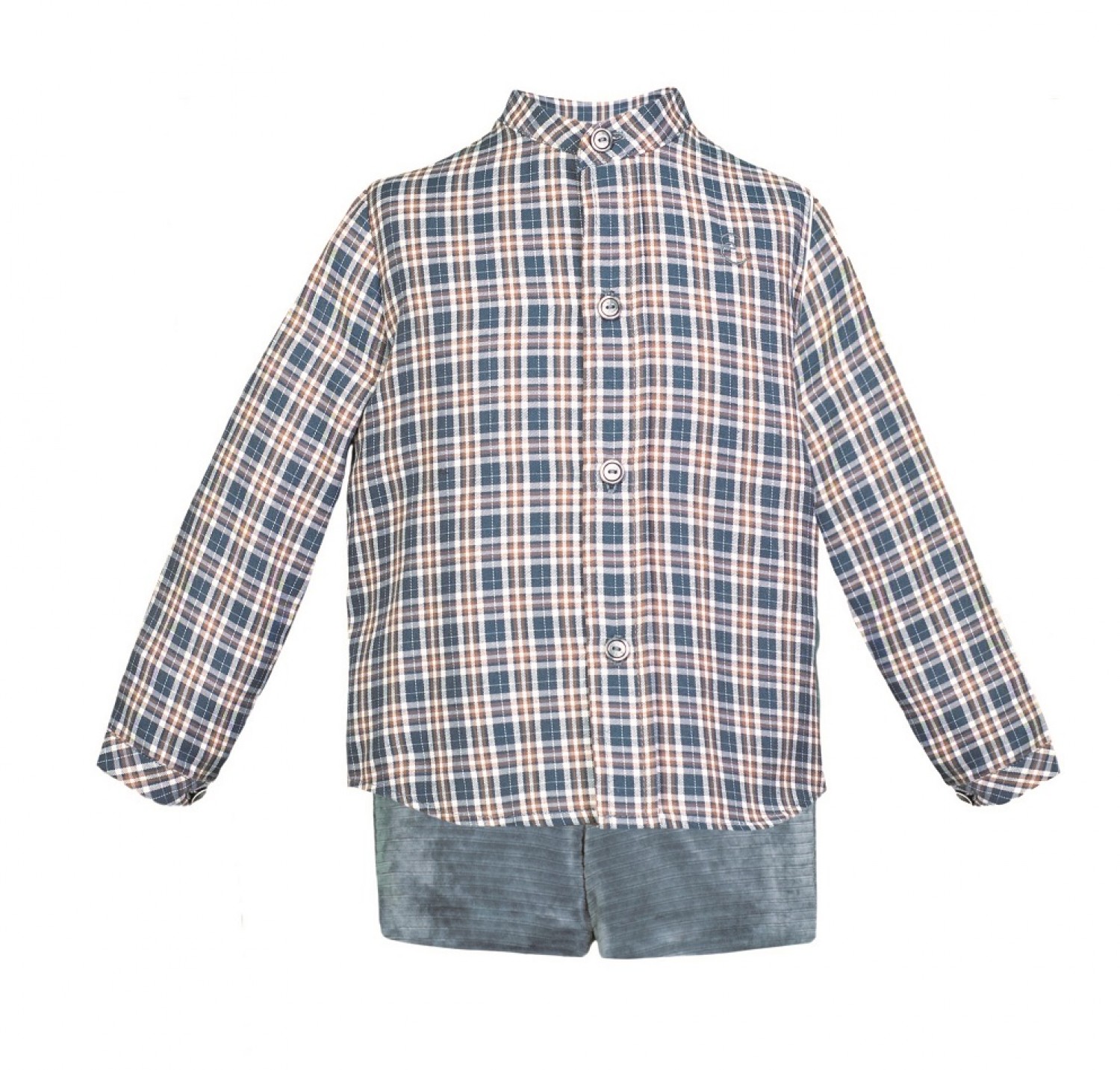 Nice and comfortable shirt and shorts set. Cobalt-colored trousers and checked shirt in cobalt and brown tones with Mao collar. It is a perfect set for any occasion.