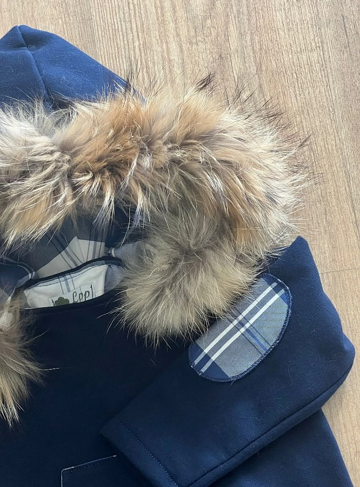 Navy cotton sweatshirt with lined hood in navy and sand checks like the pants. It has a removable fur trim on the hood.