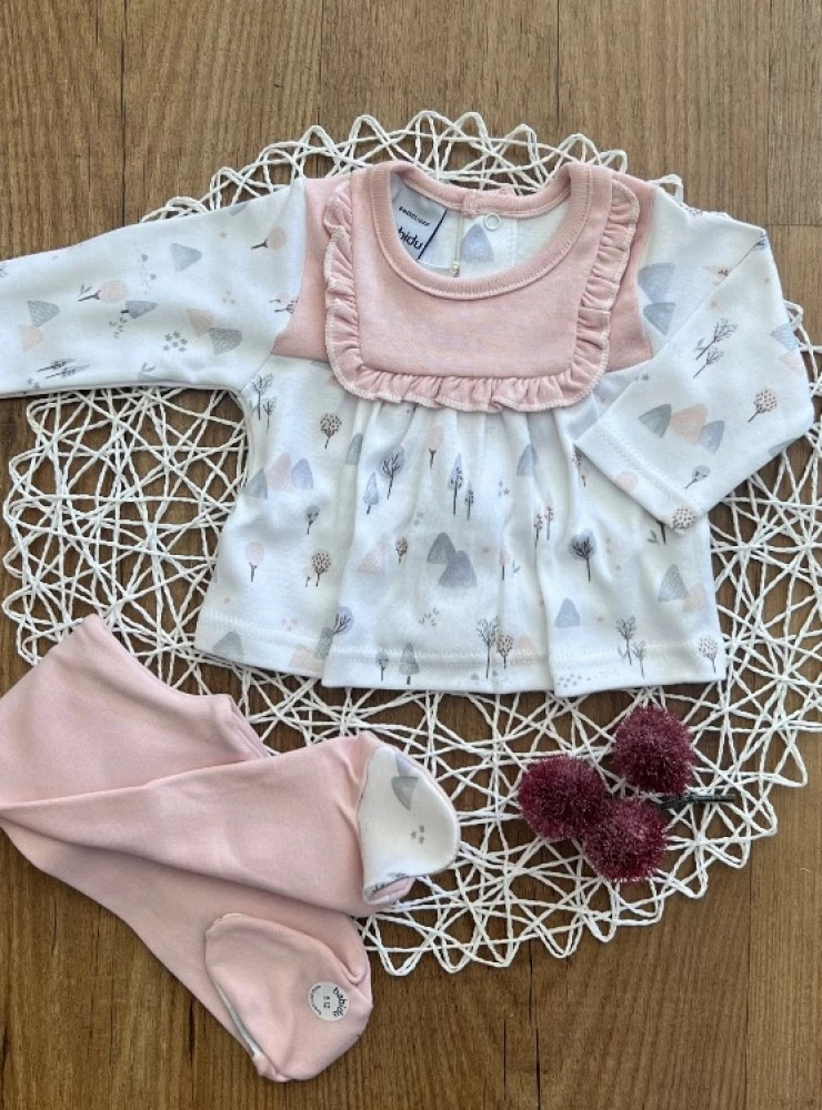 T-shirt with little trees print and yoke in powdery pink, the same as the legging.