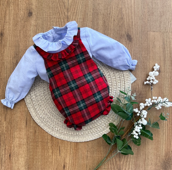 La Ranita is made of viella with the classic red and green Scottish square. She is wearing a pretty ruffle at the neck and blue blouse. Very original.