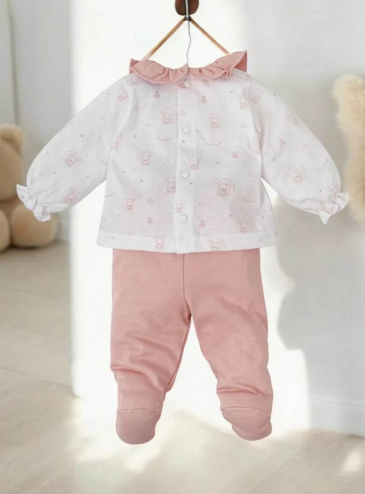 Sweater and leggings combine powder pink with white. With a nice bear print