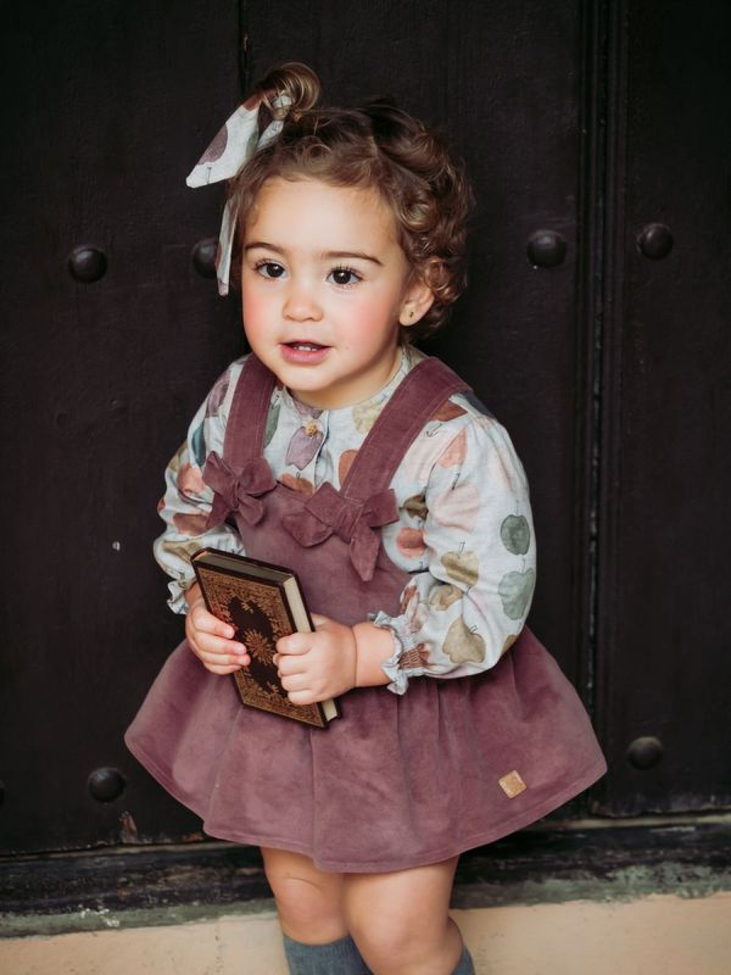 Thin grape-colored panita frog (powdery burgundy) with straps and bow, she wears a viella blouse with apple print with a large removable collar.