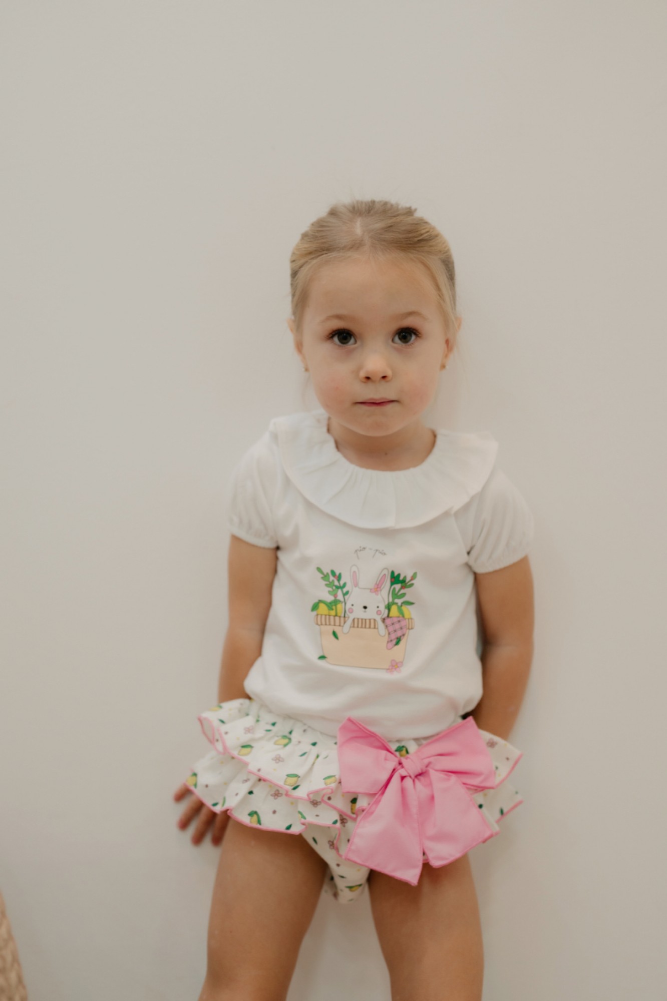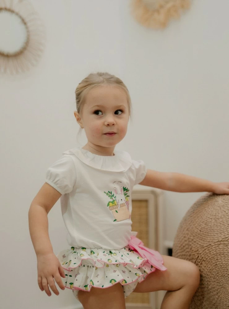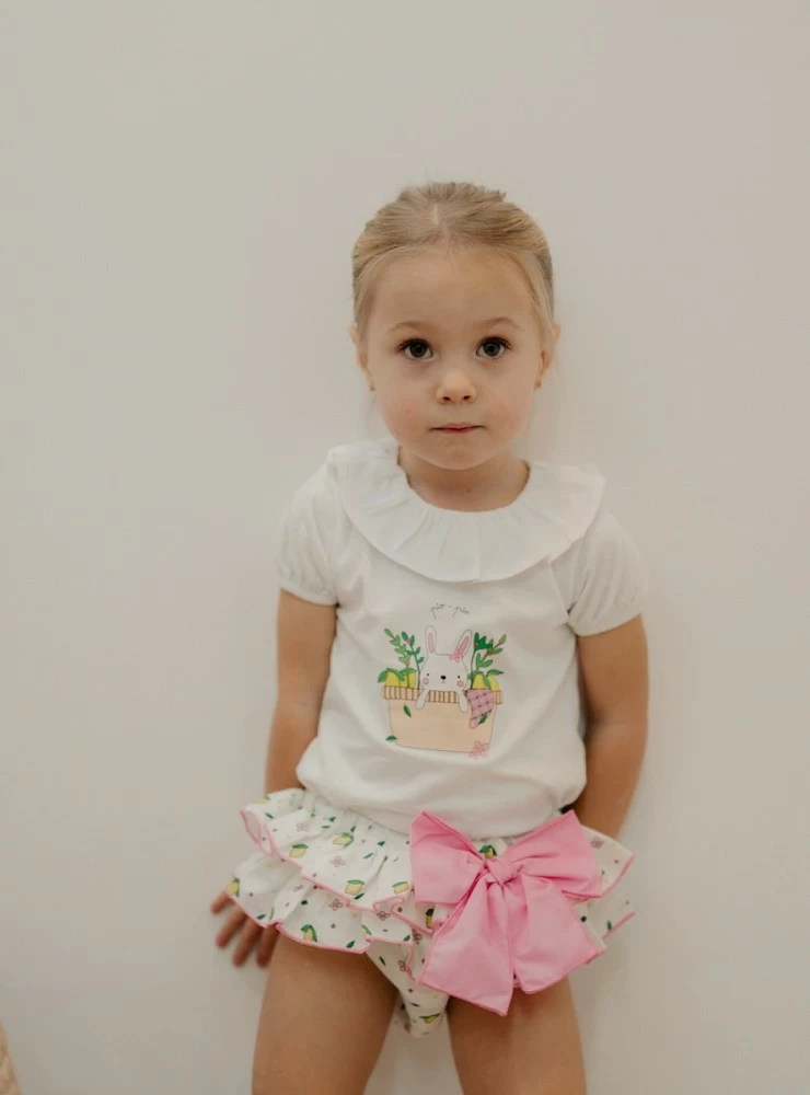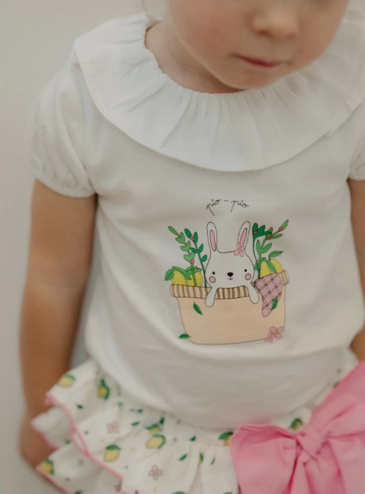 White cotton T-shirt with a ruffle collar and lantern sleeves with a pretty rabbit in a basket with lemons and ruffled bottoms also with a lemon print and fuchsia poplin bows on the sides.