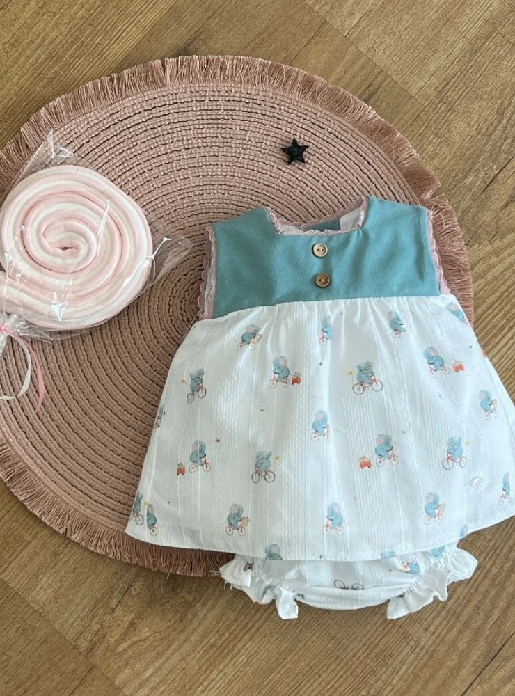 It is made of a poplin fabric with elephant-printed hemstitching and a turquoise and pink cotton body.
