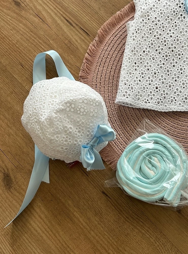 White embroidered batiste blouse and panties. She wears organdy panties in pink or blue. It is a wonder. Unisex.
