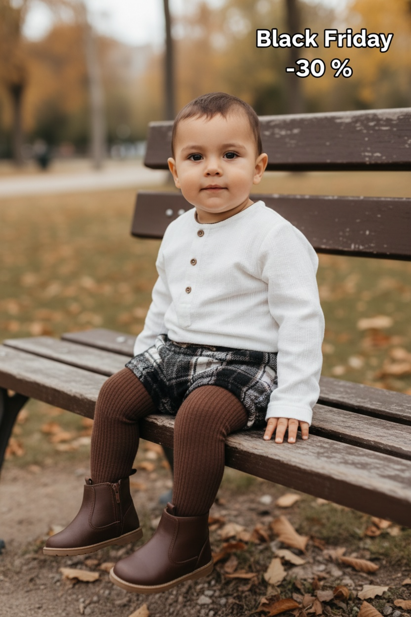 Ecru striped shirt with round neck and wooden buttons and flannel pants with black and brown checks.