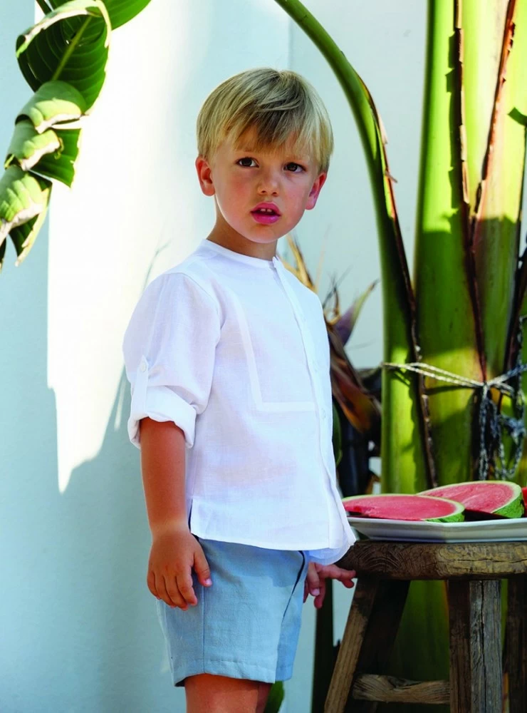 White linen shirt, long sleeves and collarless, the sleeve is prepared with a button at the elbow to roll it up, blue trousers in a cotton fabric similar to linen.