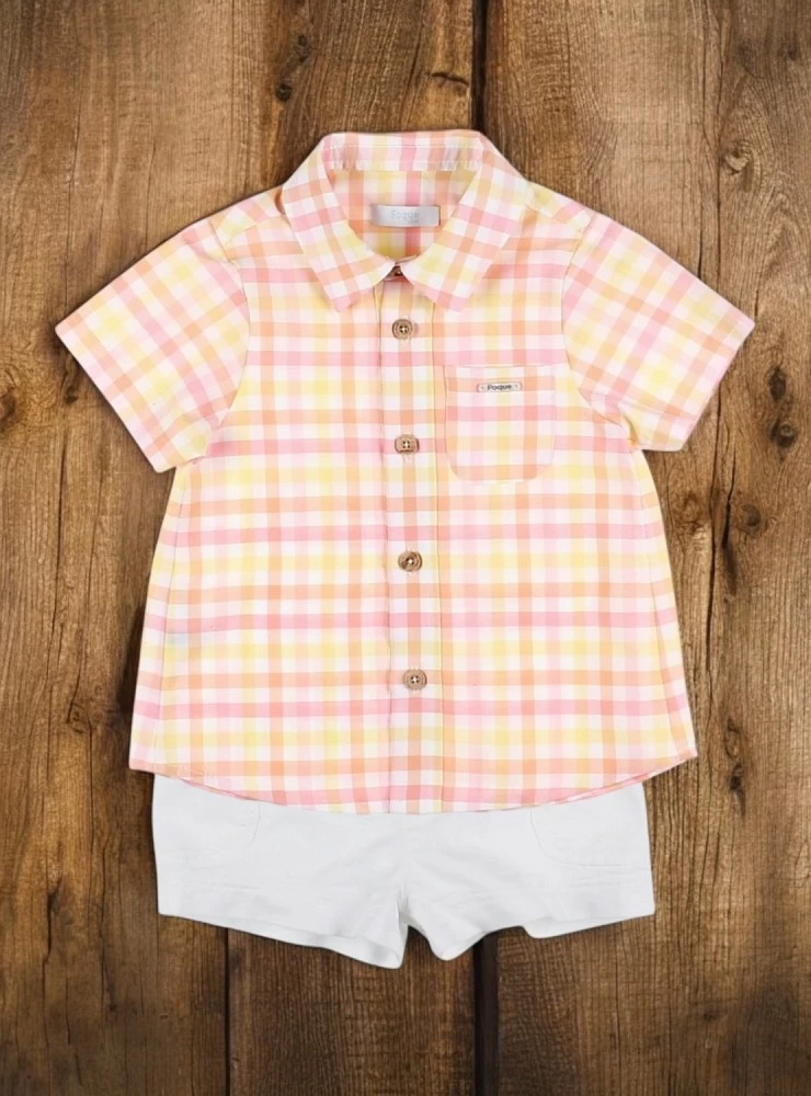 Poplin shirt with checks in pastel tones, orange, yellow etc and white canvas shorts