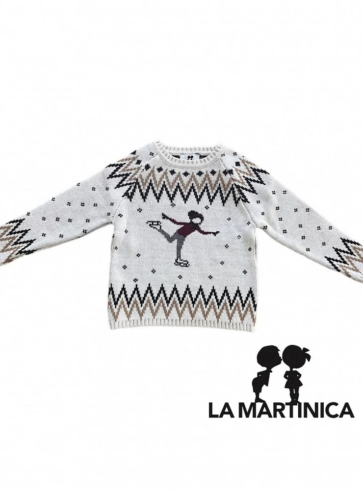 Sand-colored knit sweater with Greca in black and camel, has a skater in the center.