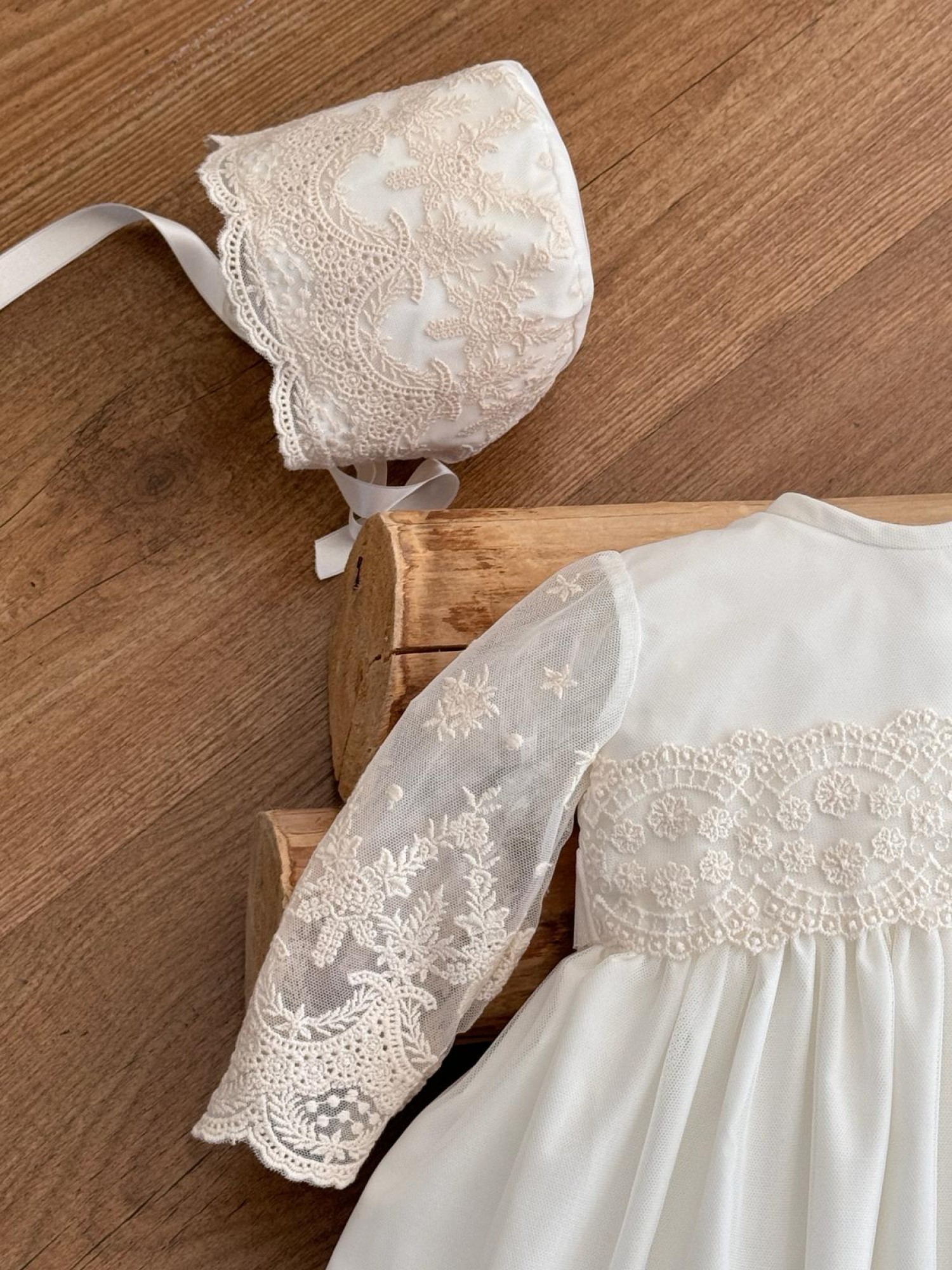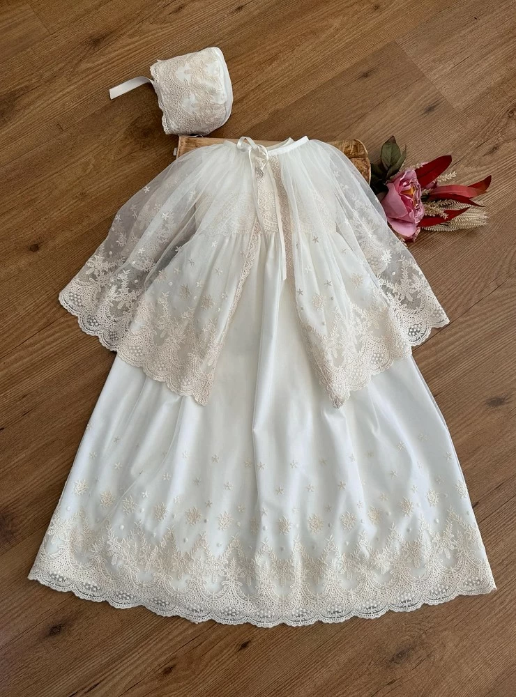 Conjunto unisex de bautizo faldon y capota, plumeti de tul