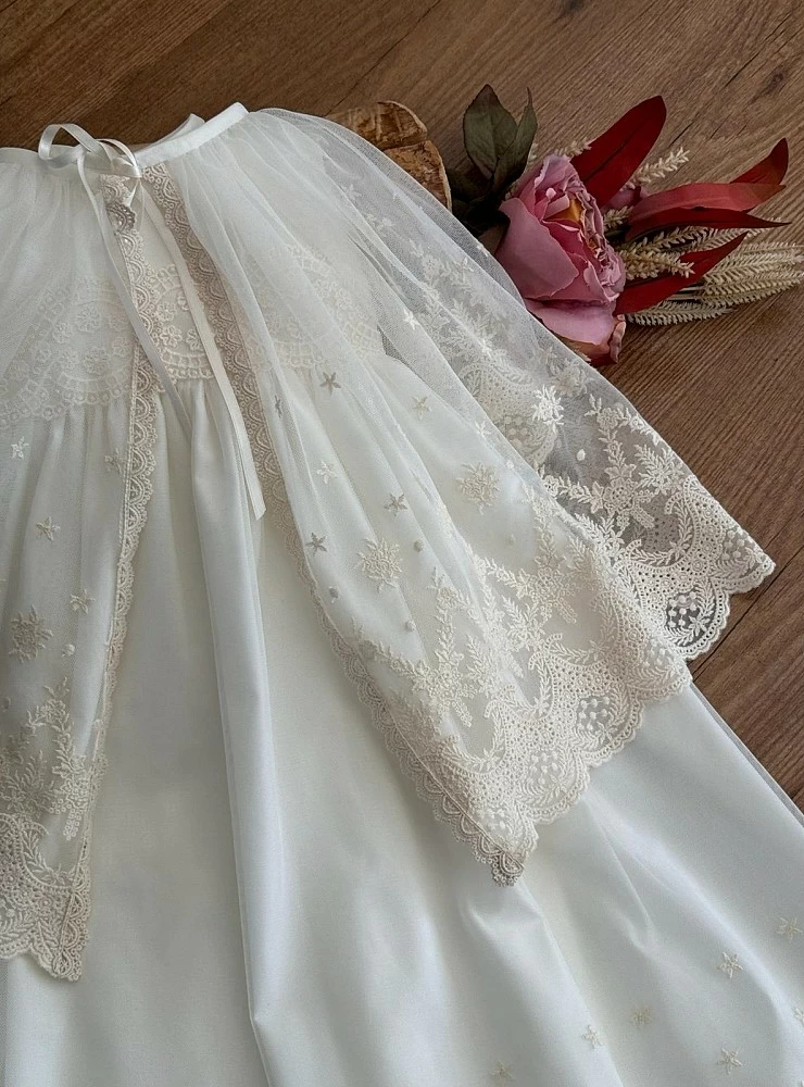 Made of the best quality embroidered tulle. Skirt with hood and cape. Long sleeve