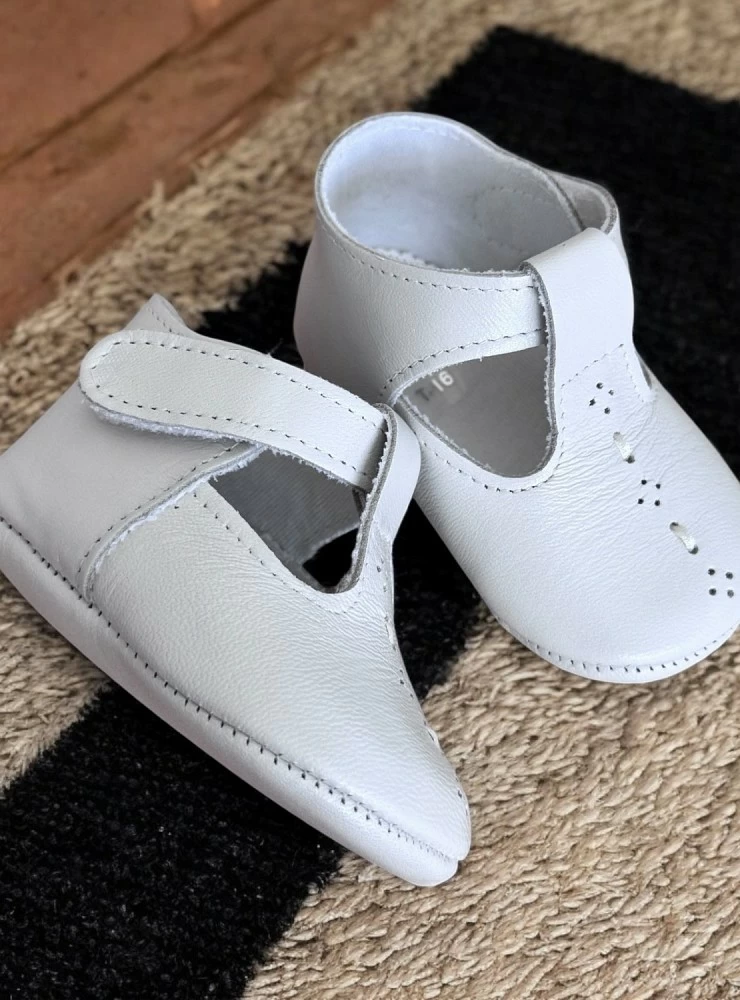 Soft leather in a light beige mother-of-pearl tone. It has a velcro closure and a soft sole.