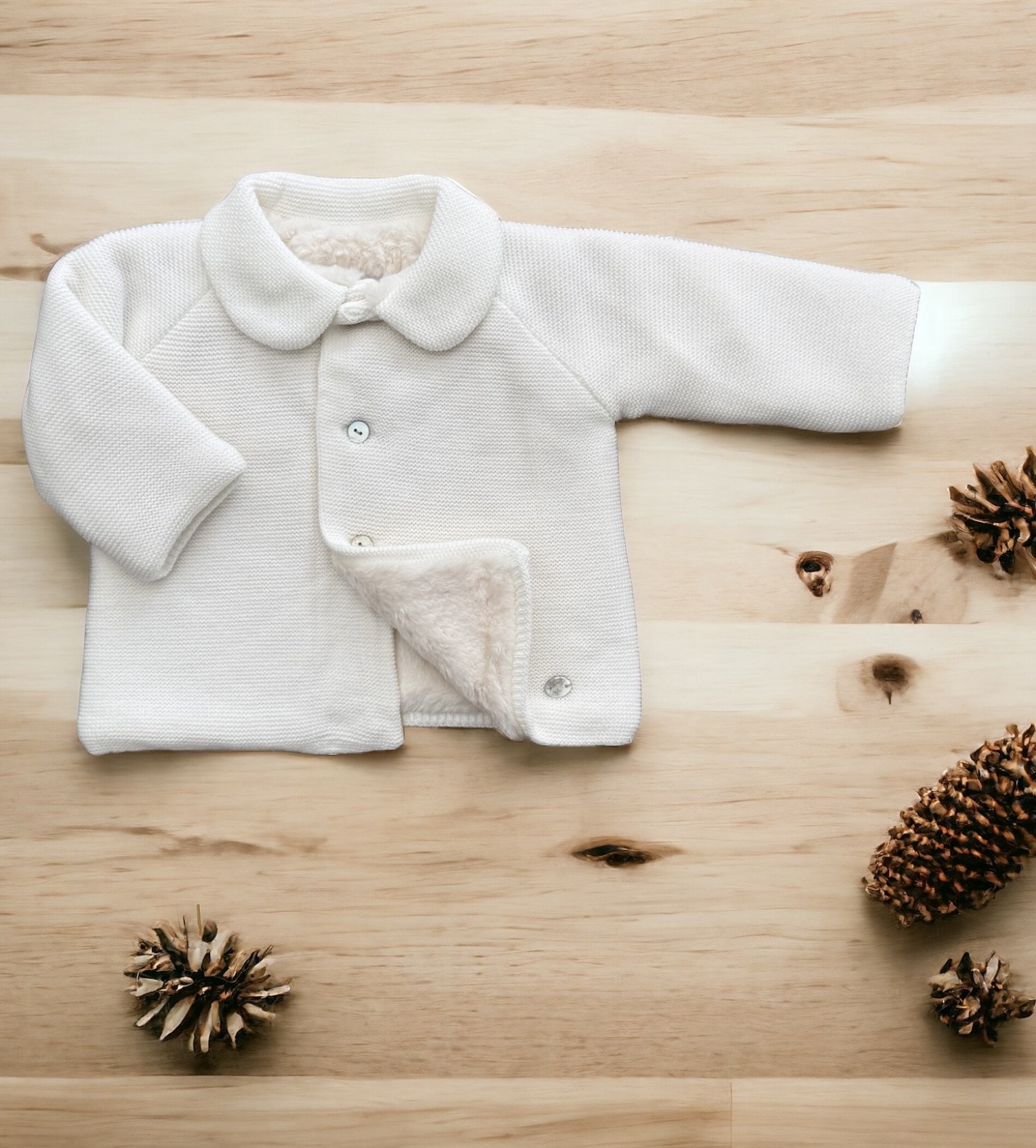Made of beige single jersey with baby collars and fur interior. Very warm for the colder months. Ideal with rompers, skirts or baptism set