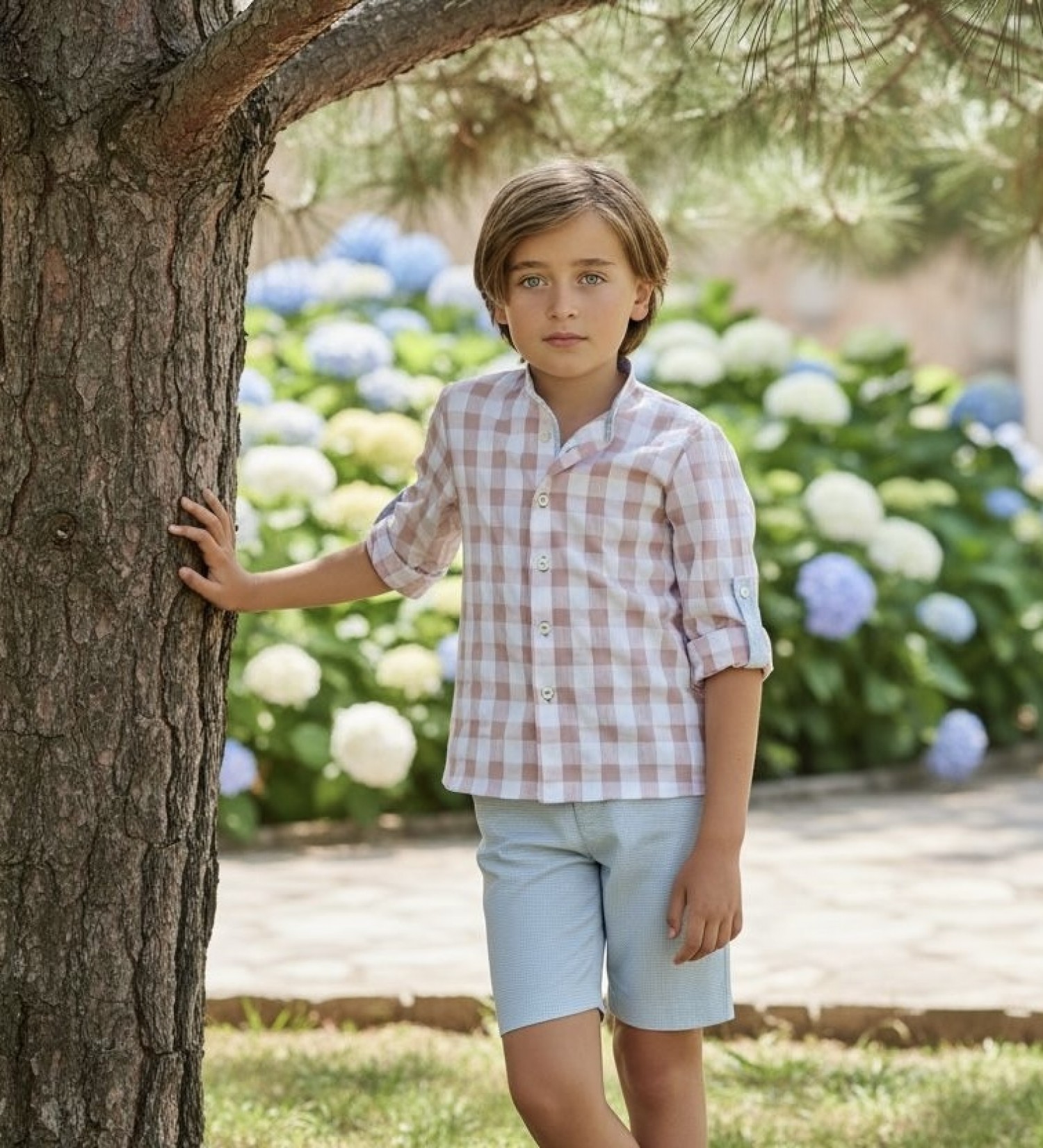The blue shorts with a micro gingham check provide a harmonious contrast, with a structured waistband and button front, creating a well-balanced and flattering outfit.