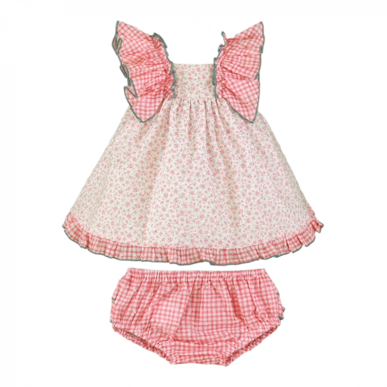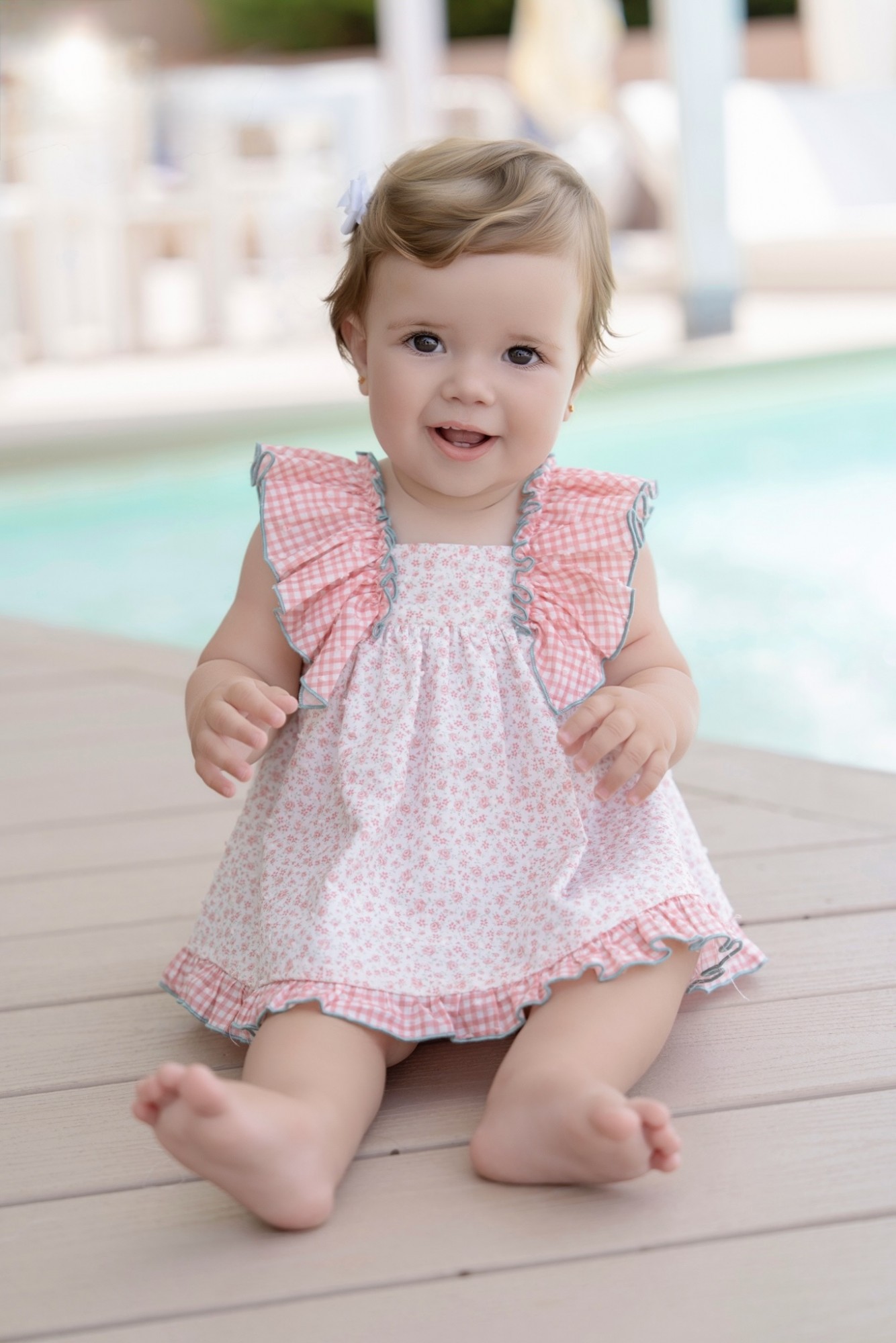 The matching pink gingham bloomers have a gathered hem and a ruffled hem, creating a romantic and summery look.
