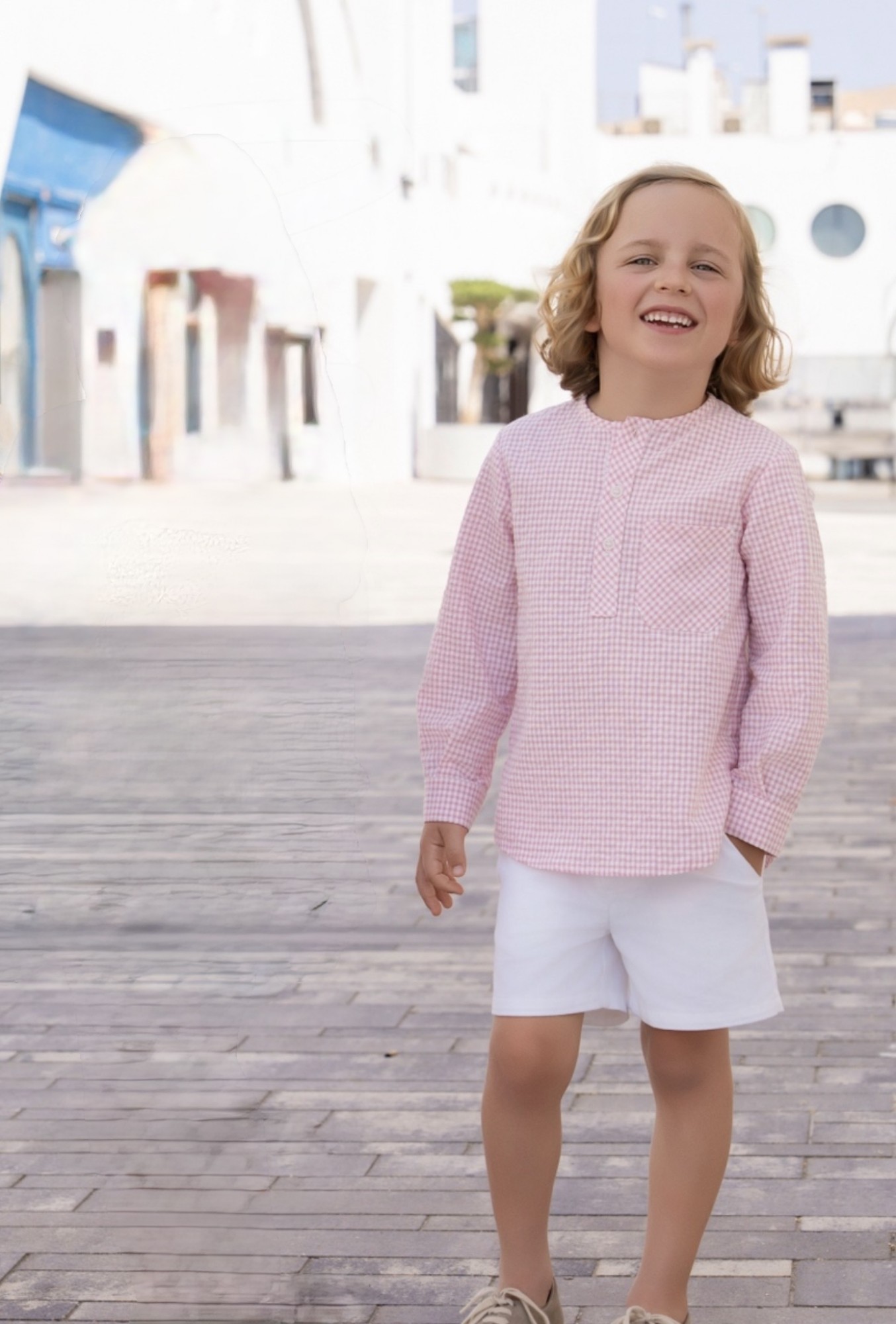 Long-sleeved shirt in pink gingham, with a mandarin collar and button placket. It includes a chest pocket that adds a classic and flattering touch.