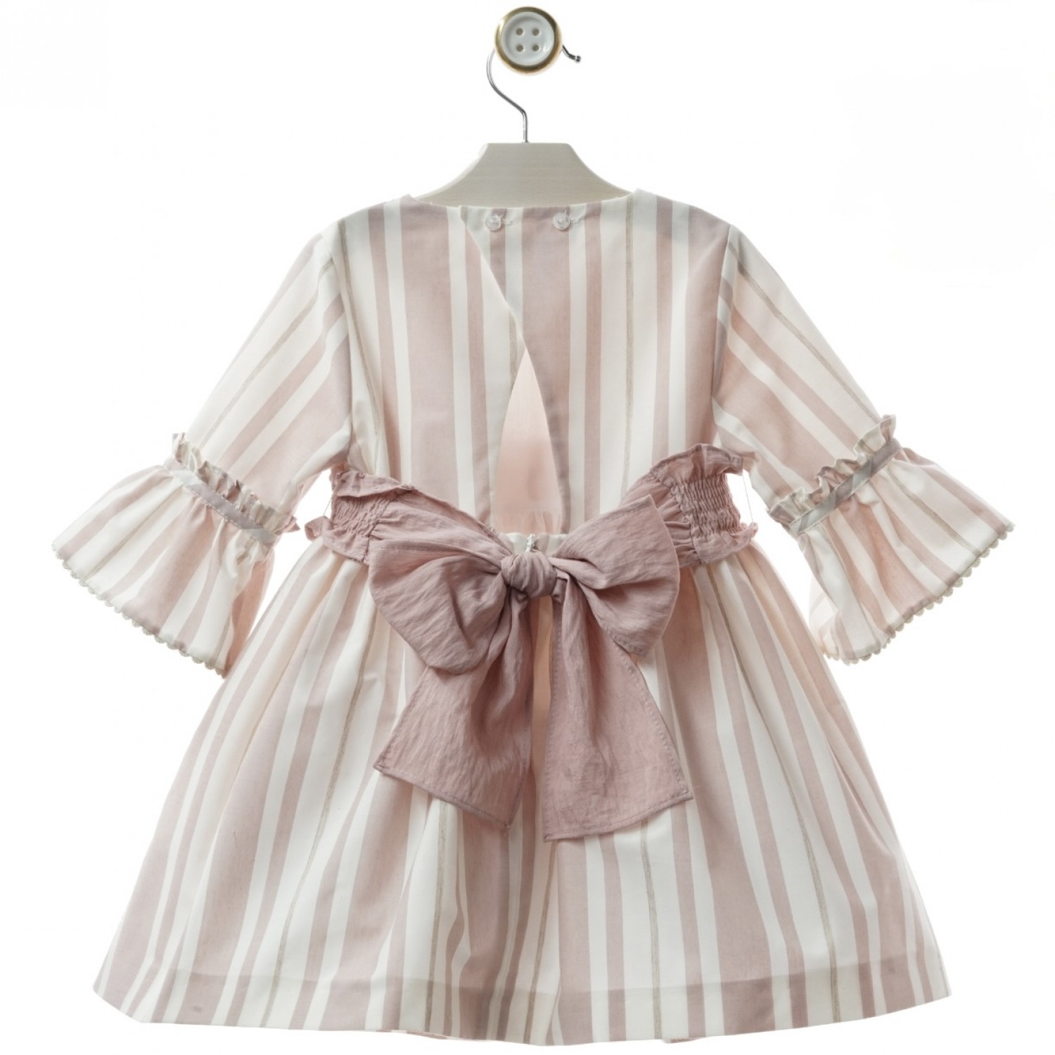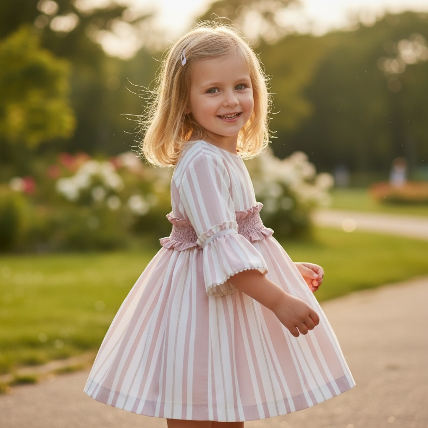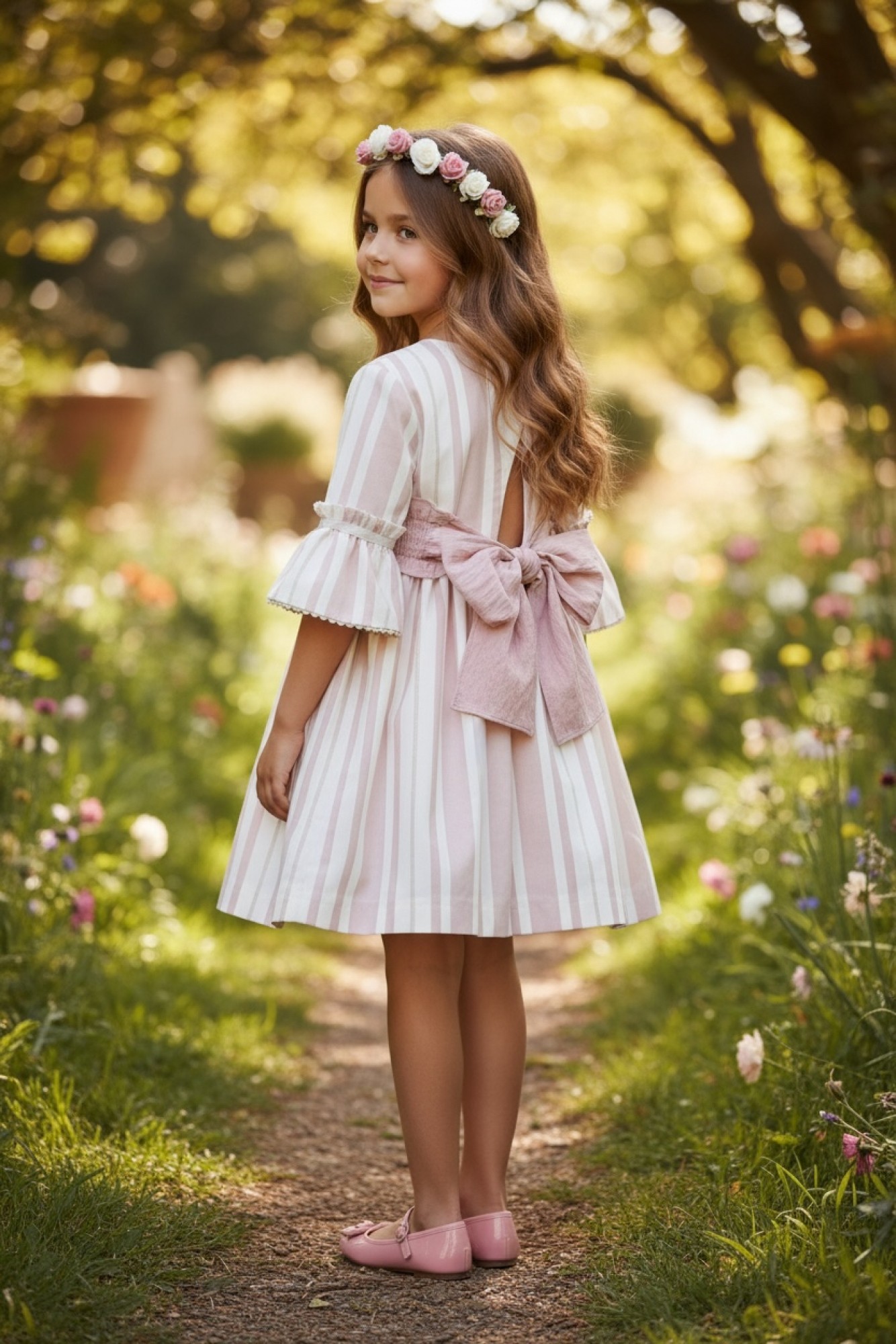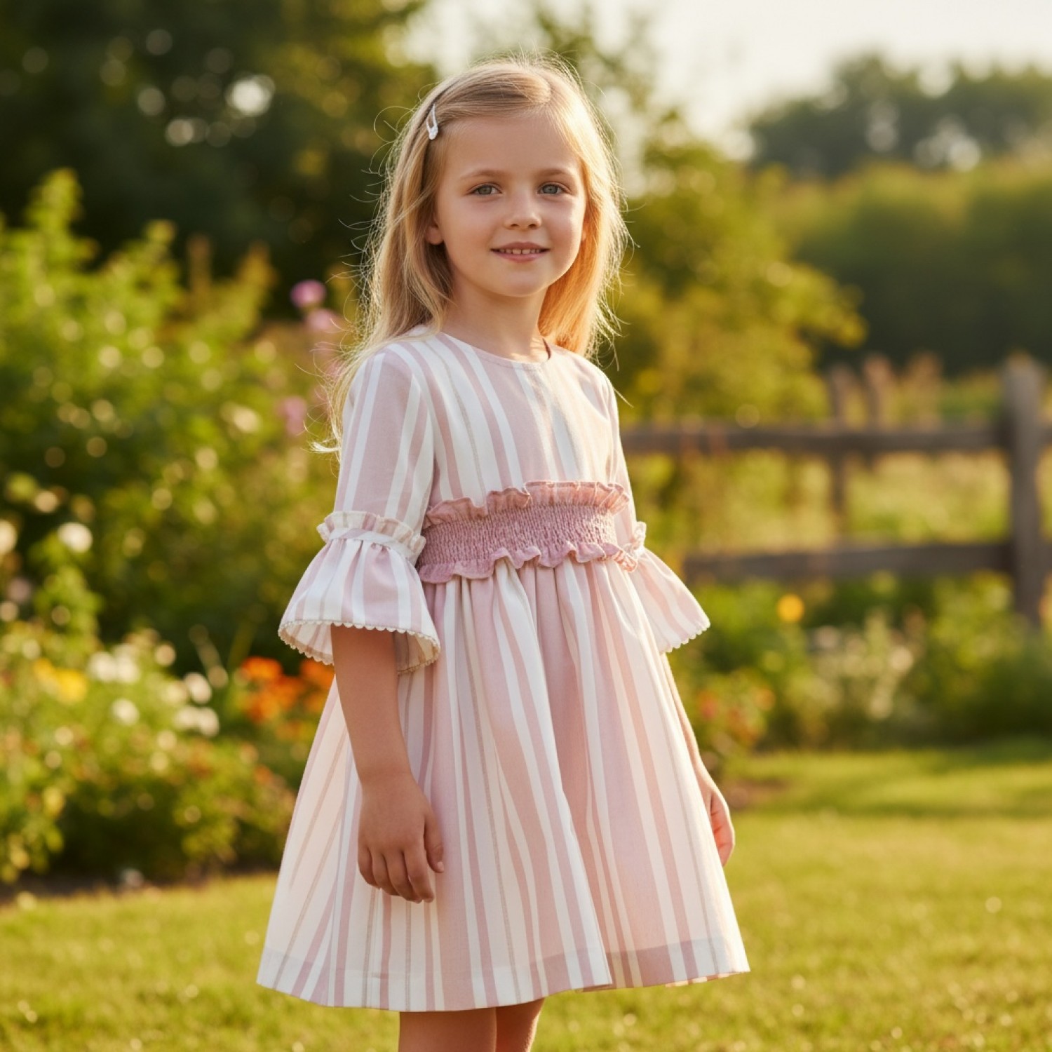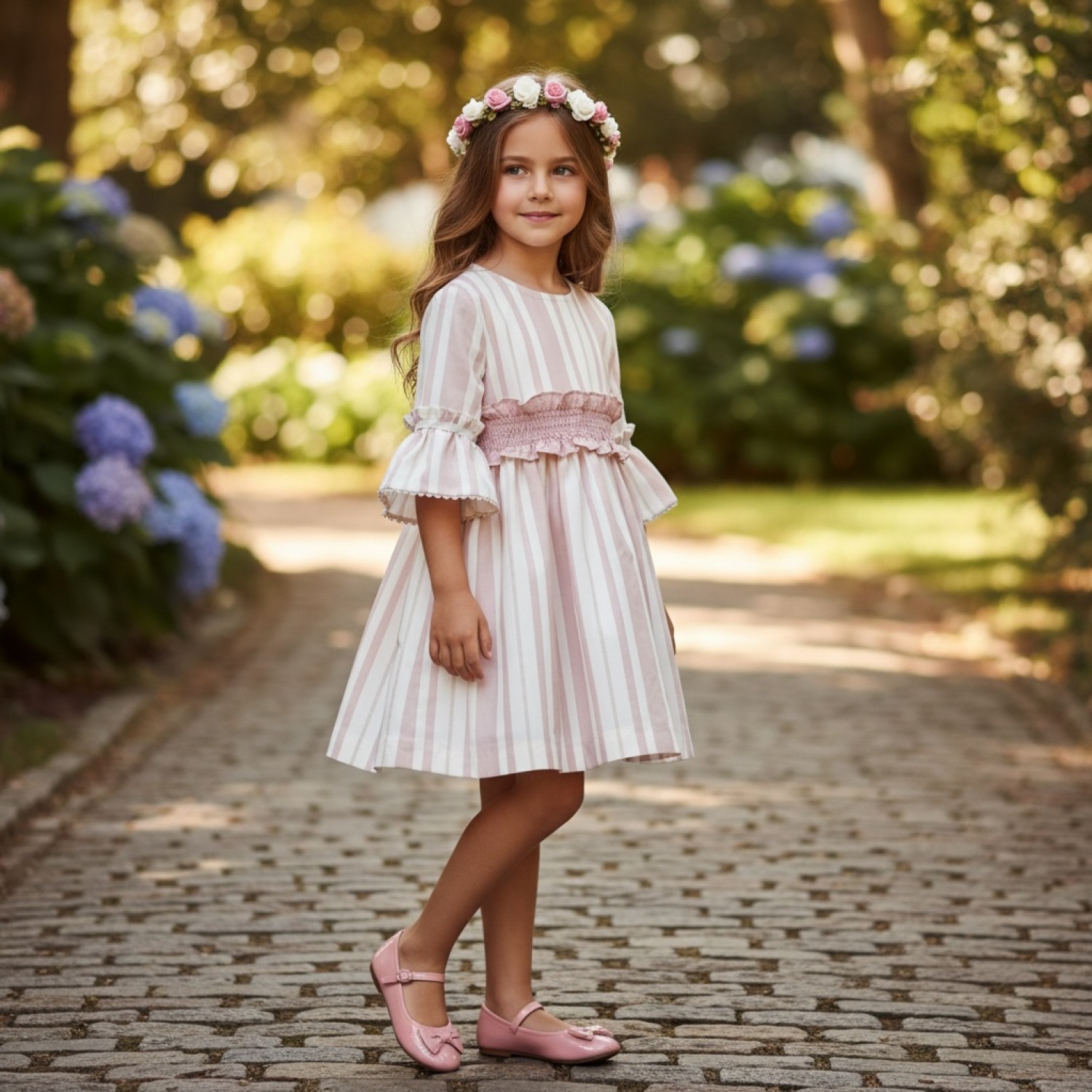 Girl's dress from the Porcelain collection, crafted from a delicate striped fabric in soft tones that adds luminosity and a very elegant touch.