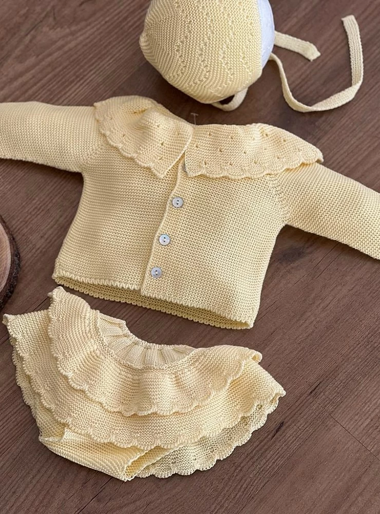 Composed of jacket. Braga. And hood (sizes 0-1- months with bootees sizes 3 - 6 and 12 without them)