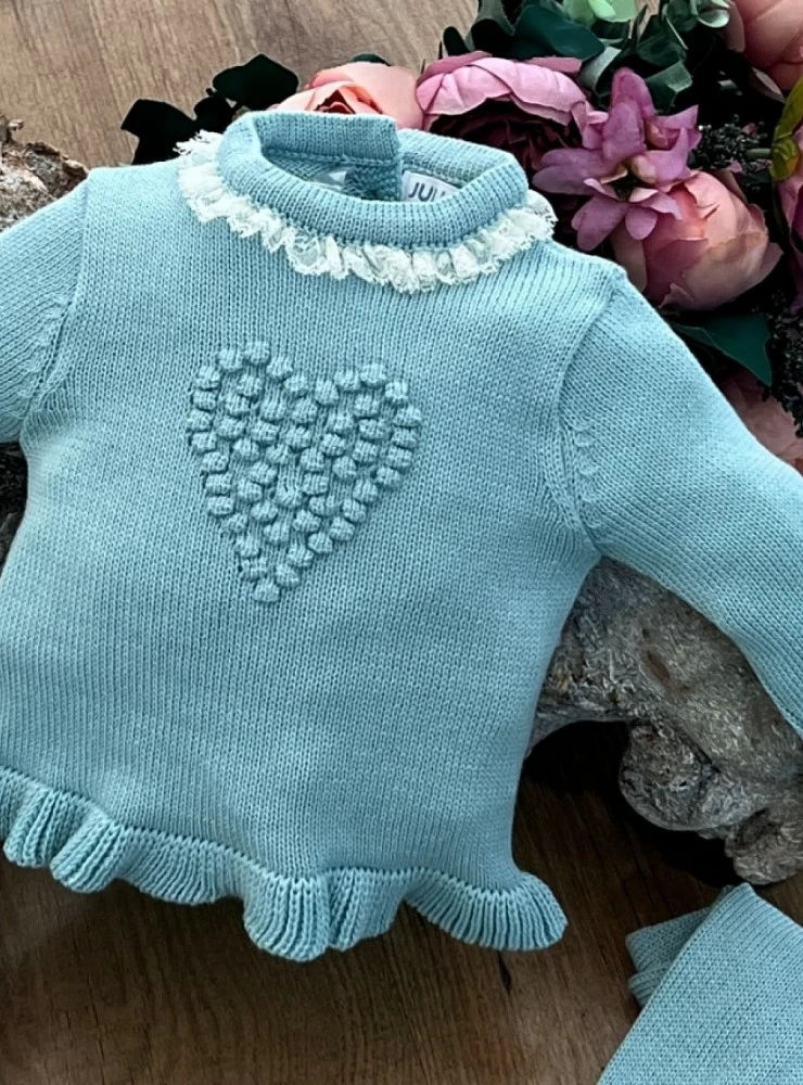 Sweater with hood and legging made in fine point in sky blue or aqua green. It has a beautiful heart of blobs in the center. The neck topped with beige valencie lace.