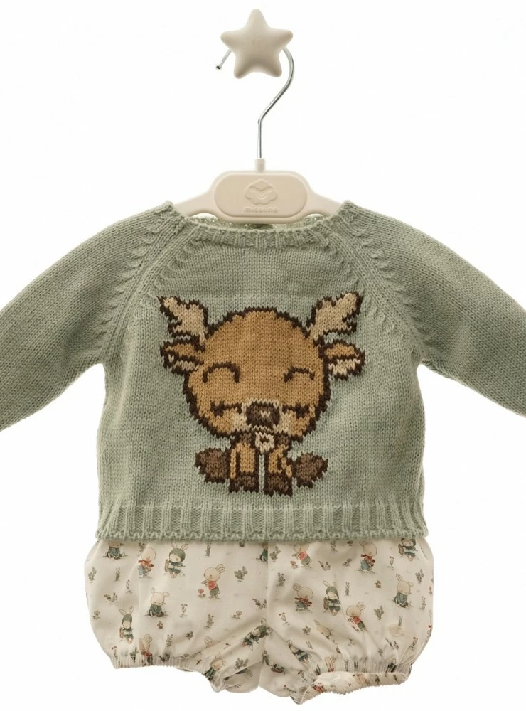 Powdered green knitted sweater with a pretty animal and white viella panties with wild rabbits. Very original.
