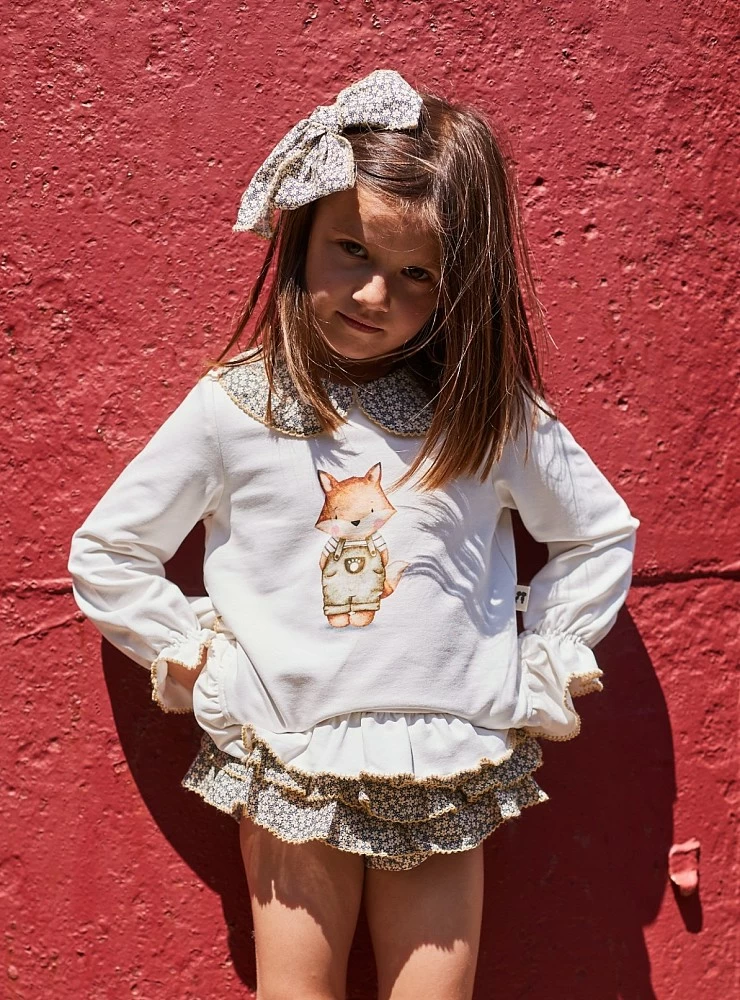 Made of cotton with lycra, it has ruffles on the hem and sleeve. Collars and elbow pads with liberty print and a very funny little fox. It belongs to the 5 Lobitos collection