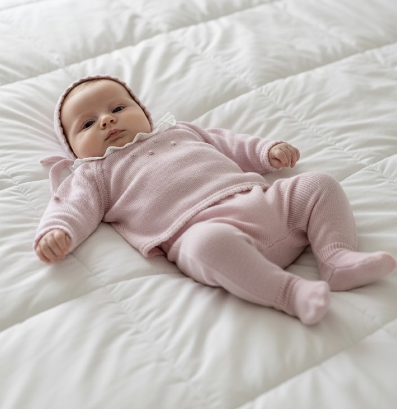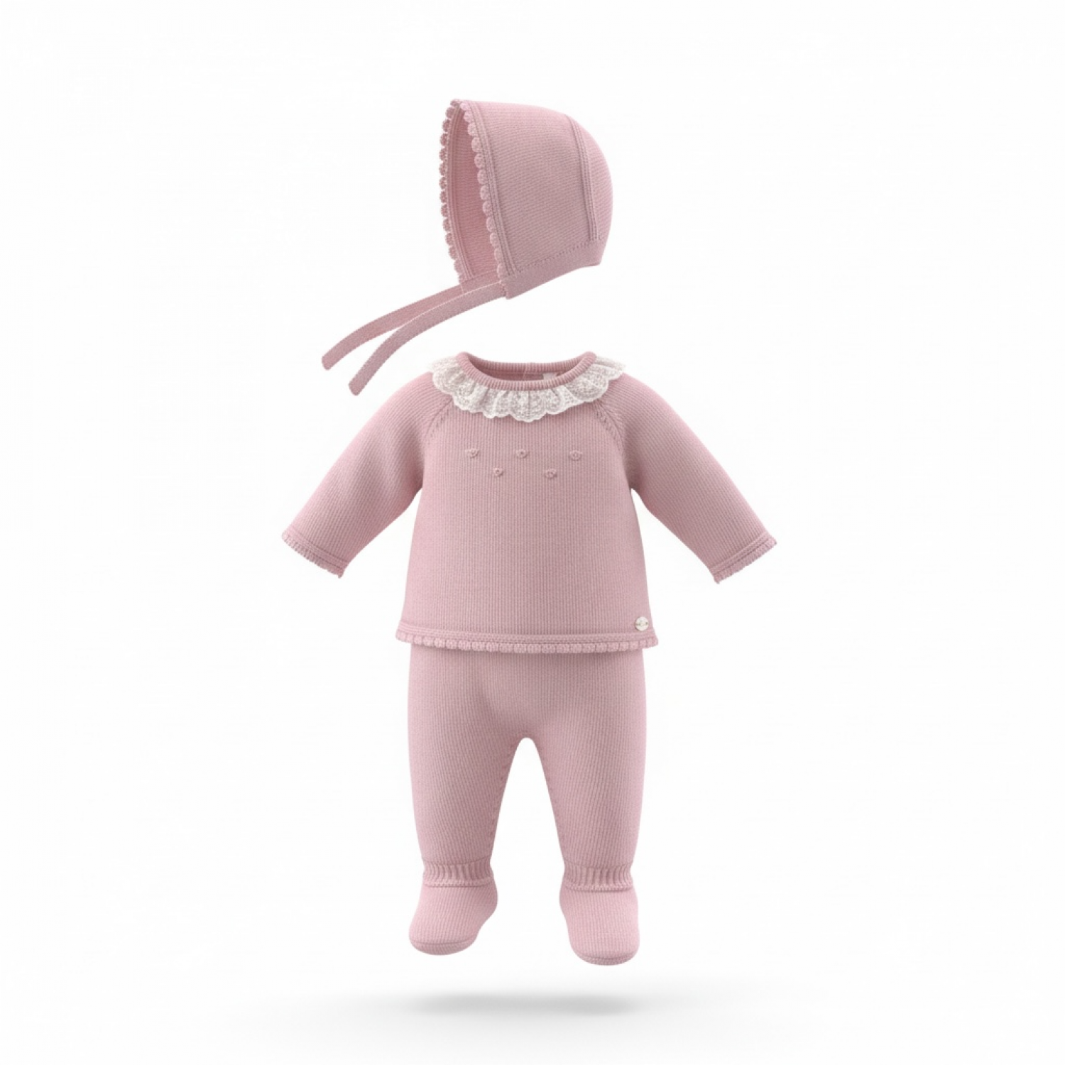 Three-piece set for girls in 100% cotton knit in a delicate dusty rose color, a soft and elegant shade ideal for first outfits and special occasions.