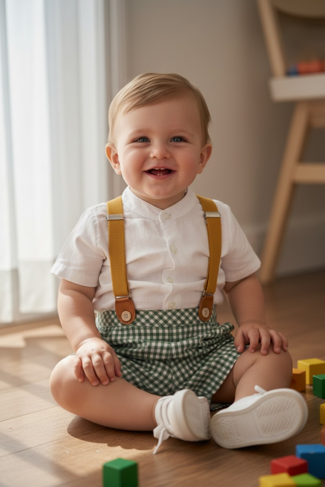 Boys' outfit consisting of a short-sleeved blouse, trousers, and detachable suspenders, designed in natural and classic tones from the Ánfora collection, ideal for spring and summer.