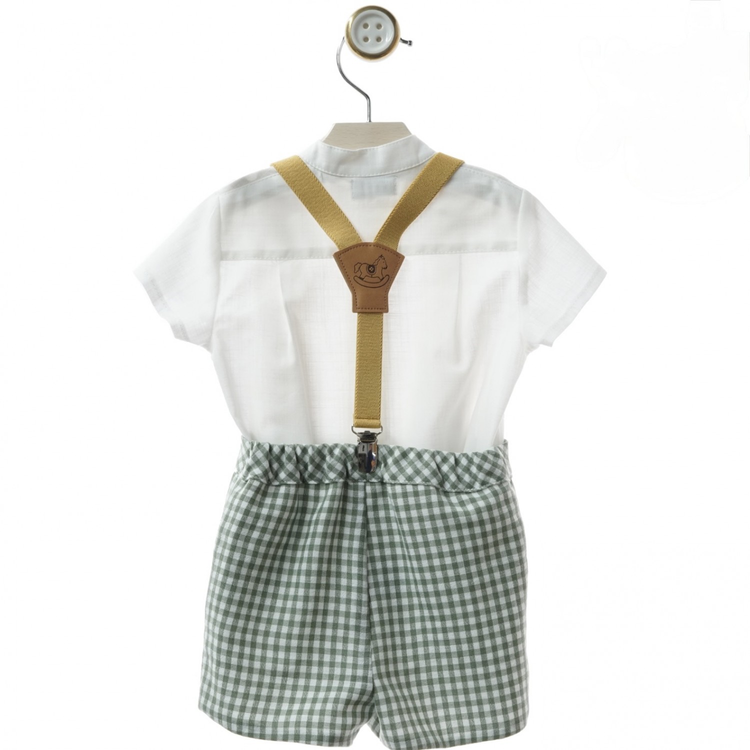 The green, small-check trousers have front pockets and are paired with adjustable and detachable mustard-colored suspenders.
