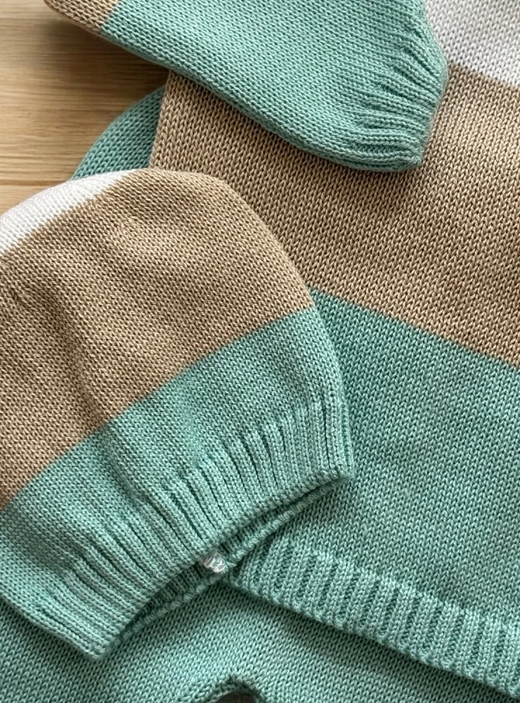 Made in fine summer knit. Striped in dry green, camel and white