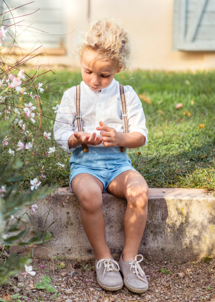 White poplin shirt with long sleeves and Mao collar, with removable camel straps and percale shorts (similar to linen) in powder blue
