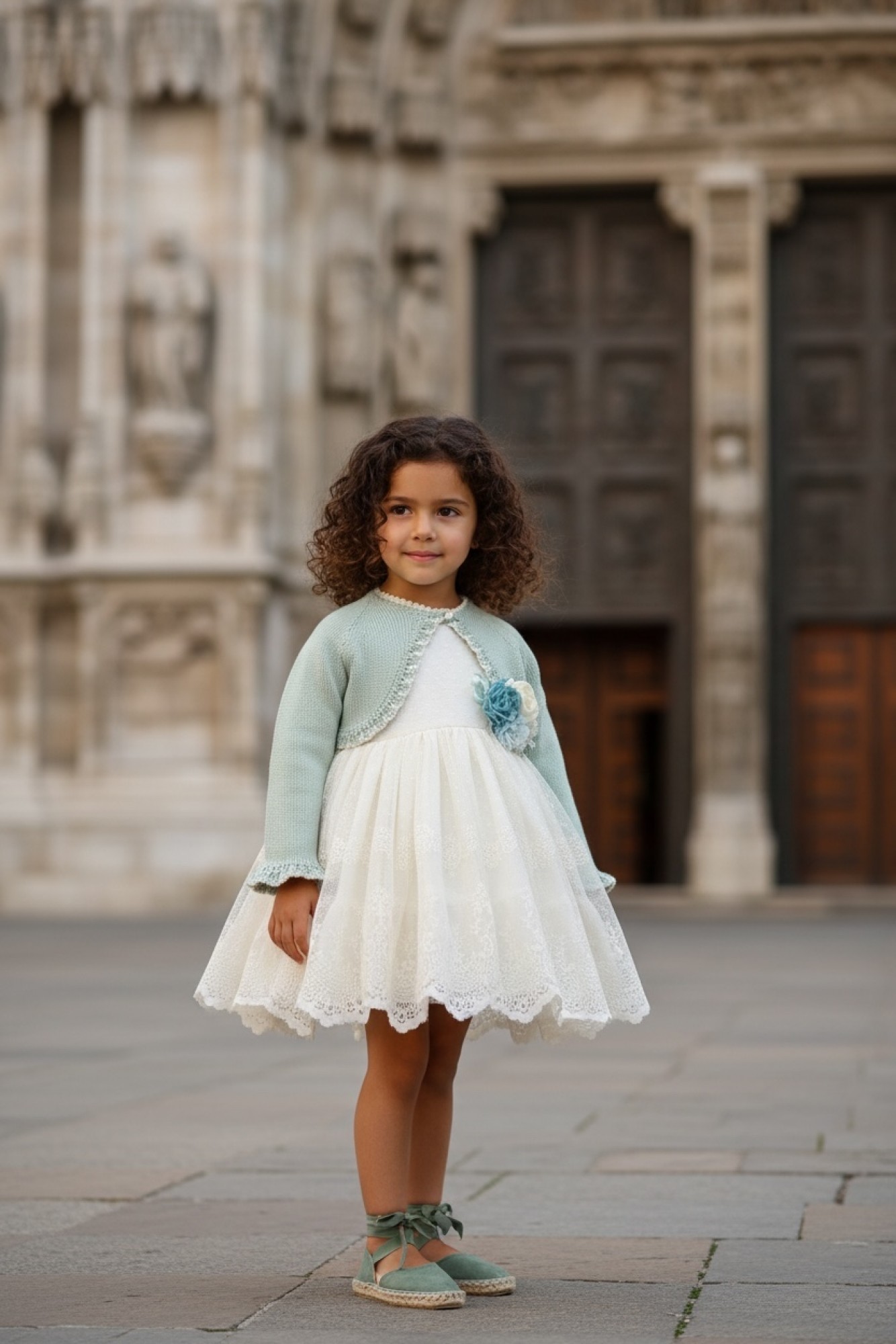 The matching jacket is in a very soft aqua/mint green, with lace trim around the hem and cuffs, perfect for when it gets a little chilly.