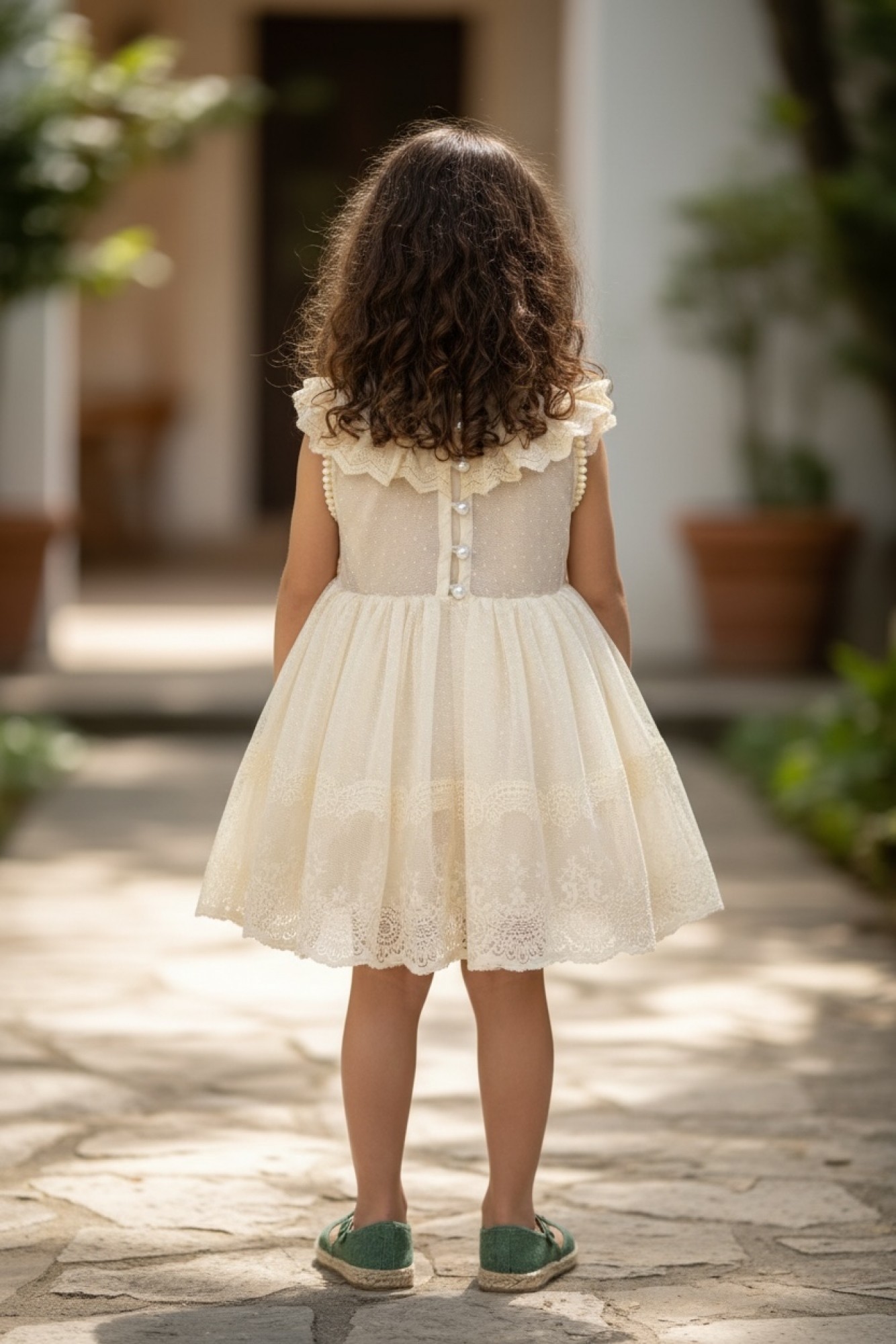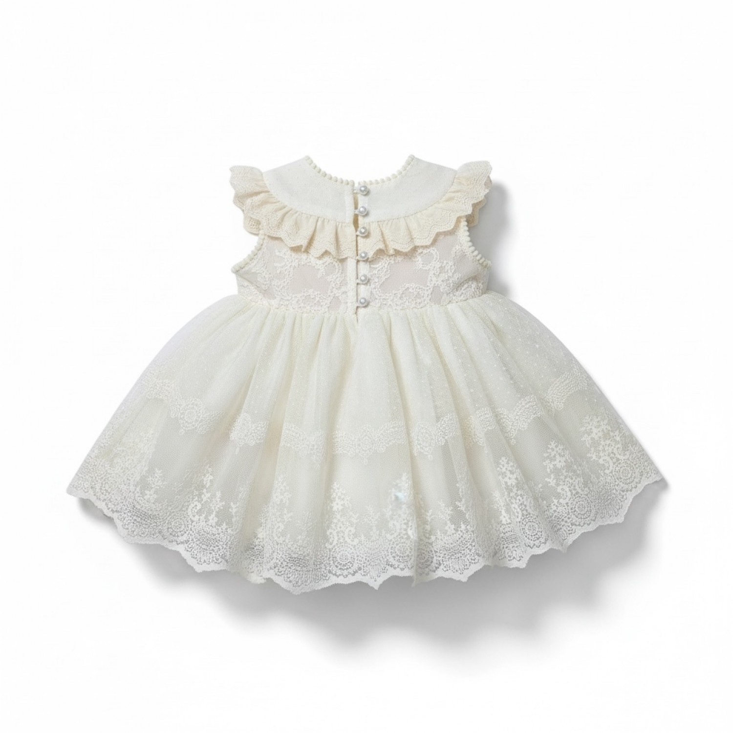 Back: The dress has a wide collar with a ruffle and lace trim, and fastens with a row of buttons down the back, creating a very refined and special finish.