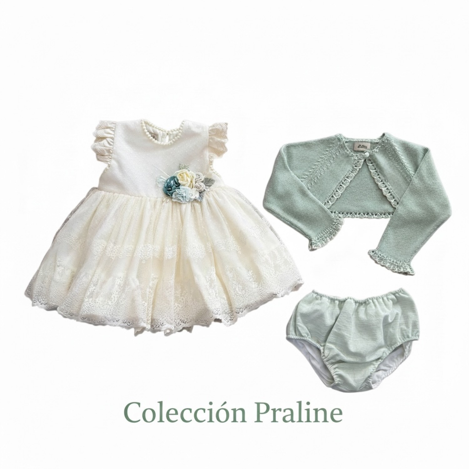 A matching baby dress set with bloomers and a jacket from the Praliné collection, ideal for special occasions and events in spring and summer.