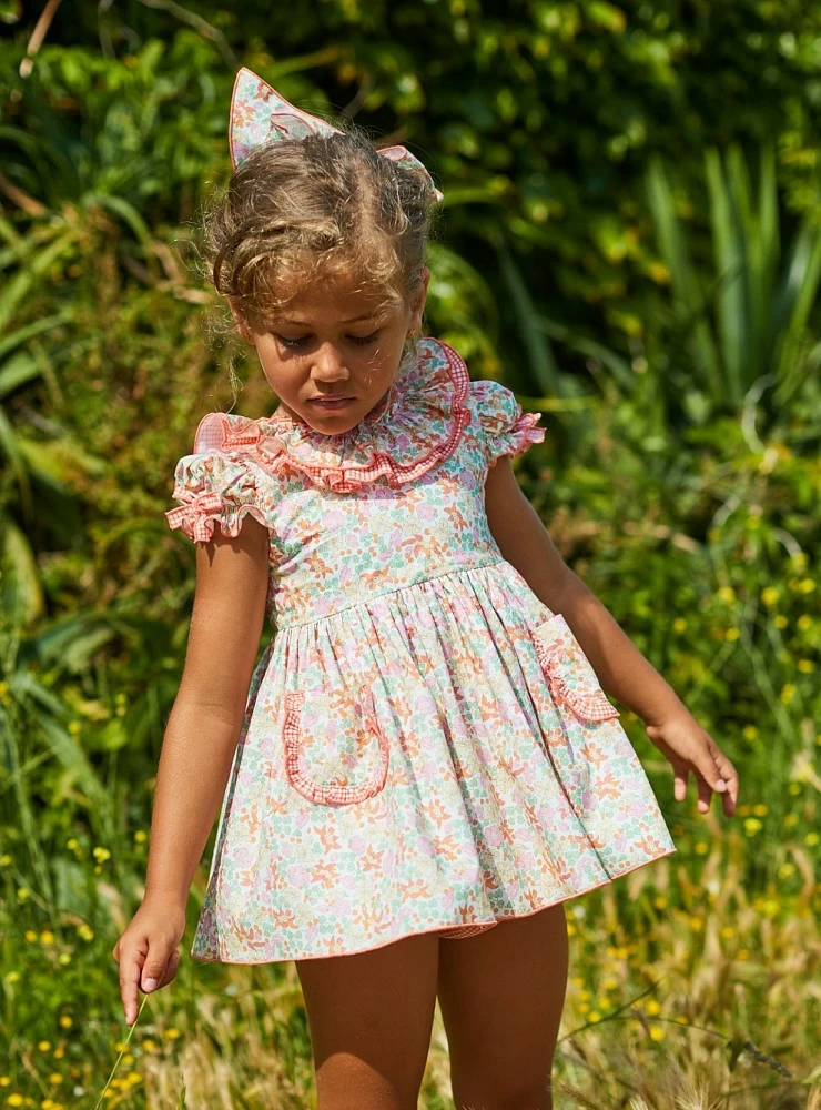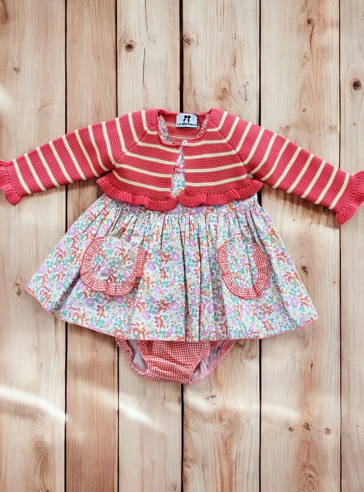 Batiste dress with pastel-colored flowers. Includes gingham panties and a tangerine and yellow striped jacket.