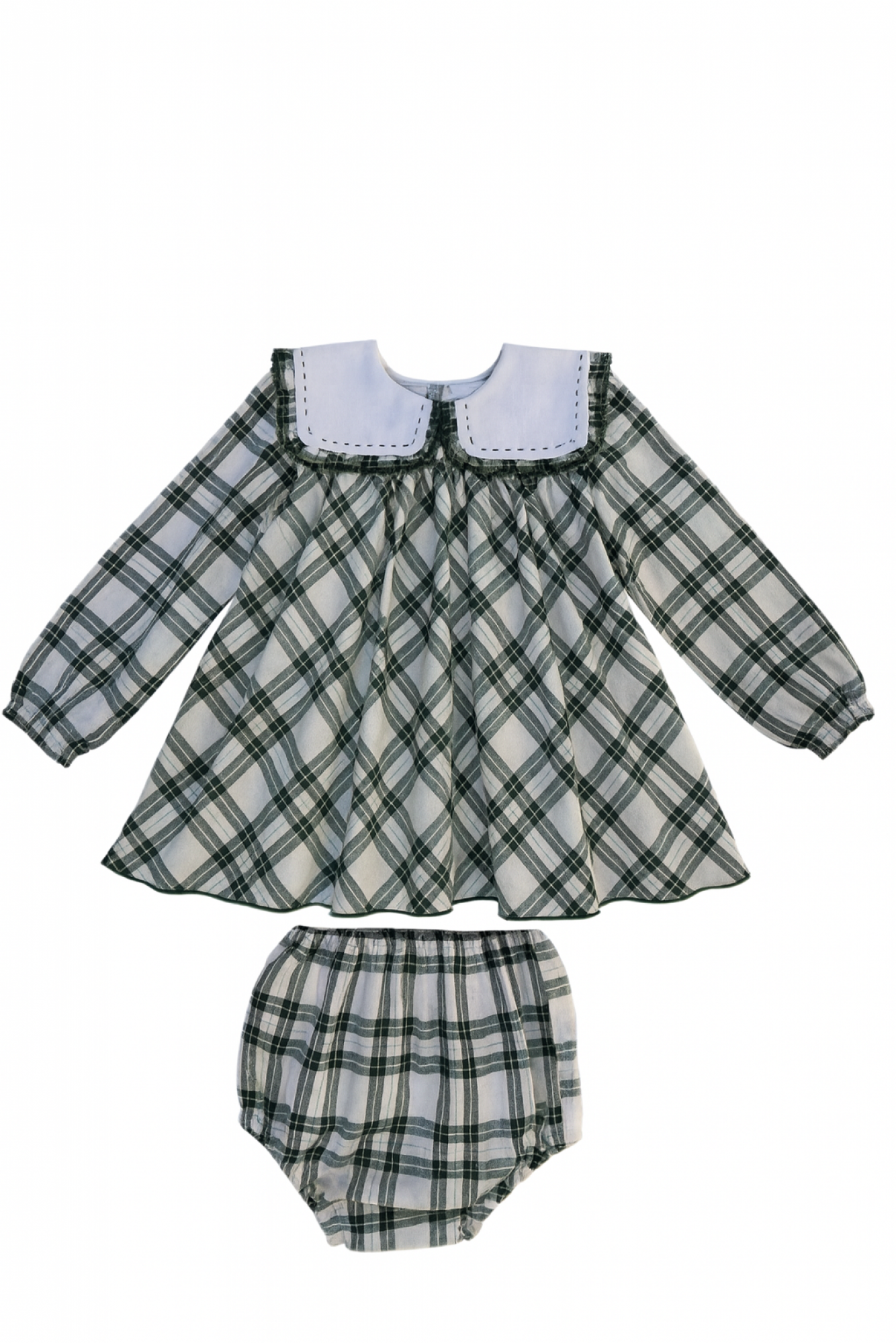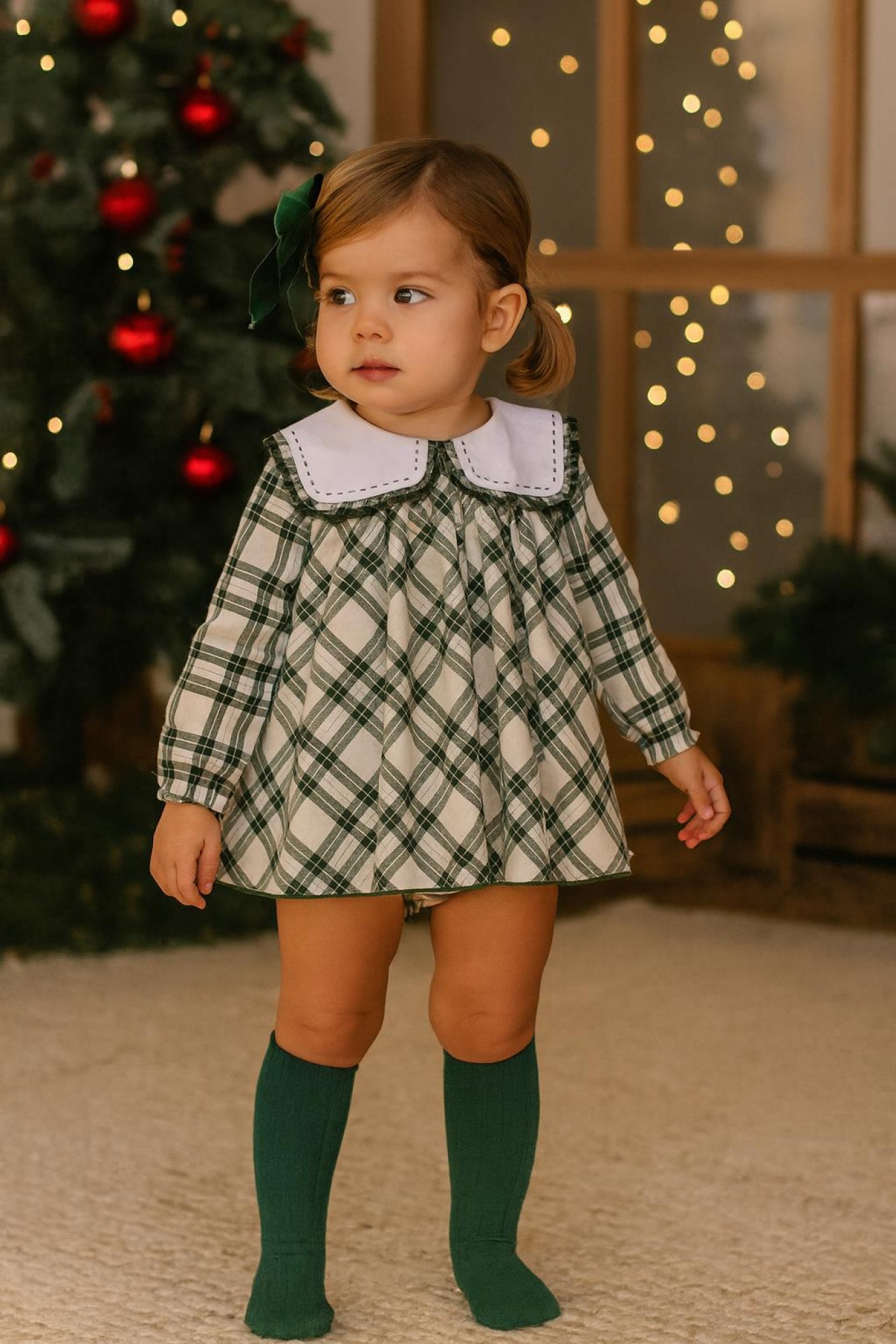 A charming plaid dress in green and off-white tones, featuring a square white collar with a green piping and decorative stitching. This elegant and special design is perfect for those important occasions during the season.