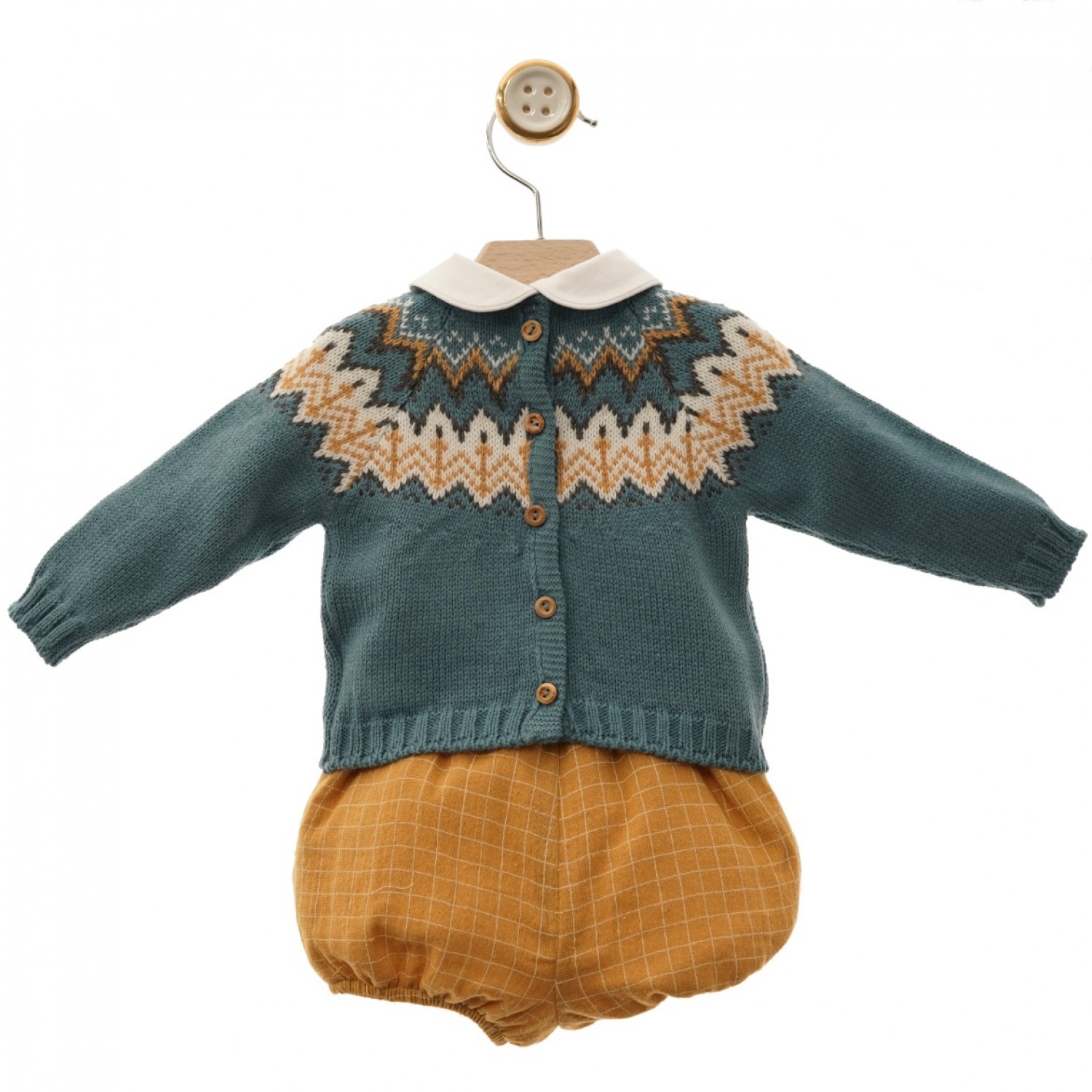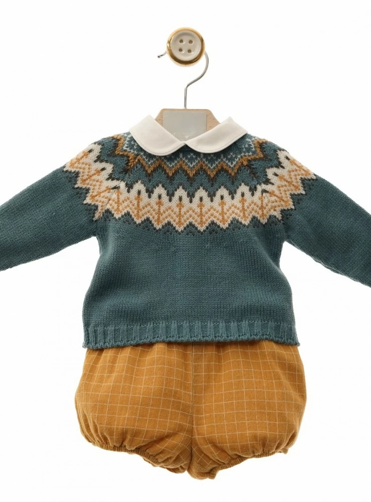 Turquoise knit sweater with mustard and ecru border. He wears viella baby collars, muslin bloomers in mustard squares.
