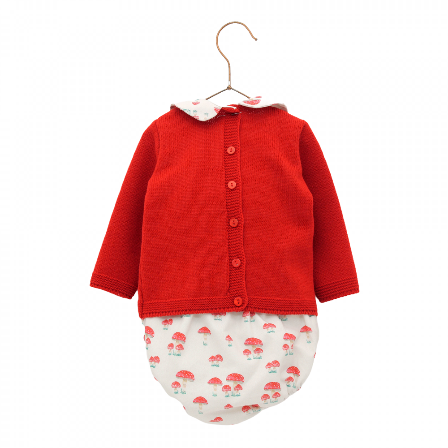 Composed of a red knitted sweater with a pretty gnome in the center. Baby neckline to match the briefs with mushroom print. Very original.