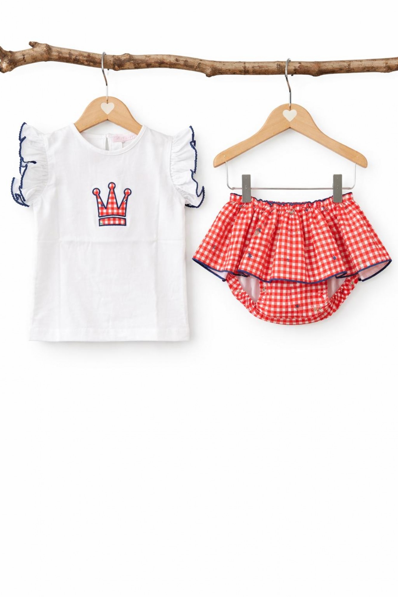 The matching bloomers combine the coral and white gingham print with small blue embroidered details and a scalloped hem with blue trim, creating a beautiful and summery contrast.
