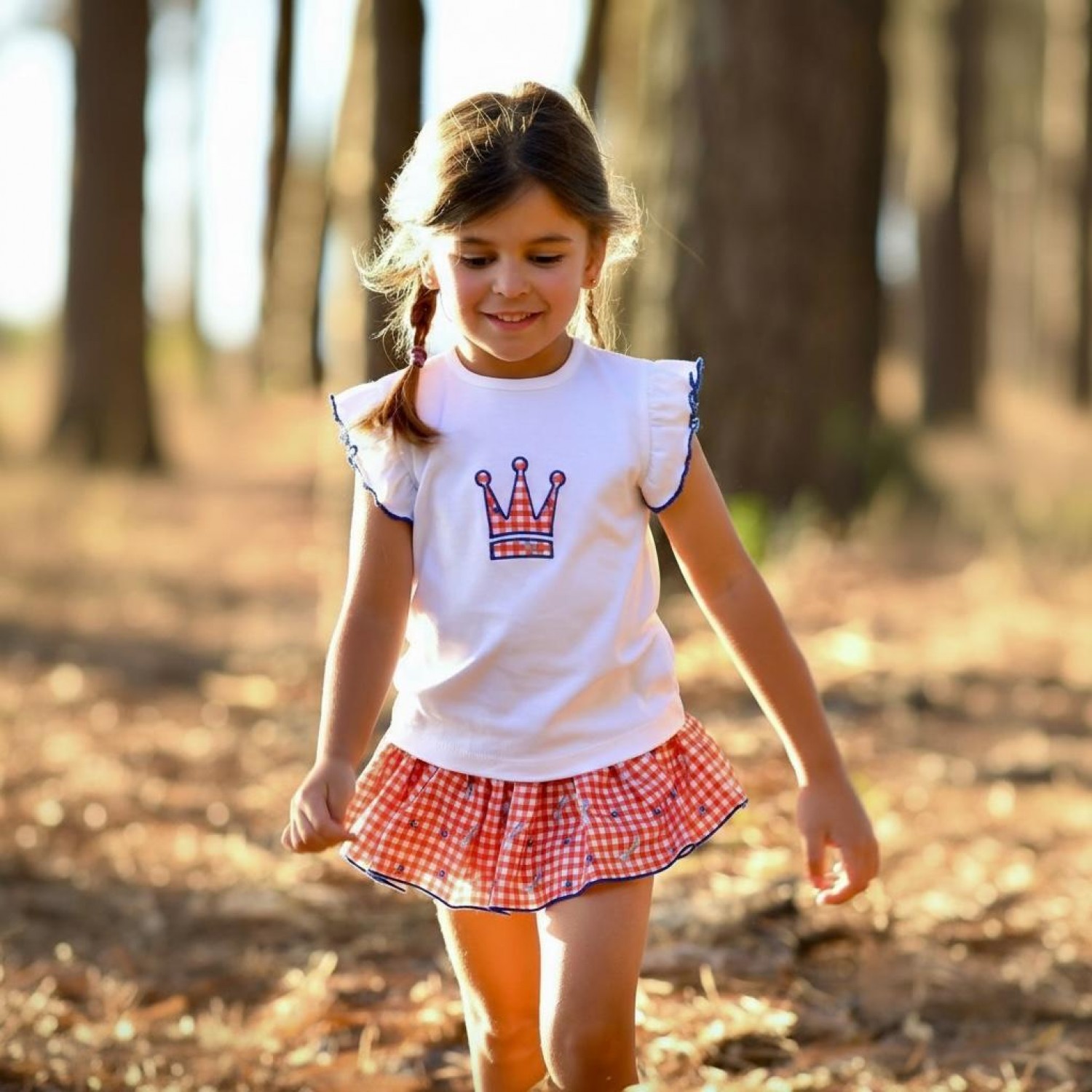 The front features a delicate embroidered crown in coral and white gingham with a blue detail, a signature design from Eva Castro that adds a touch of style and a particularly refined finish.