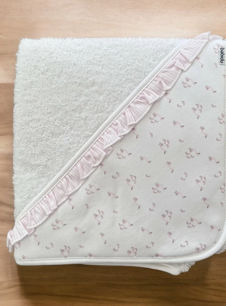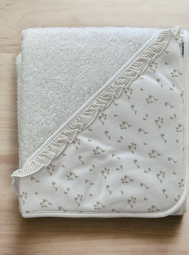 Made of 100% cotton. White terrycloth with white cotton cap corner with duckling print and matching stripe board. Great quality