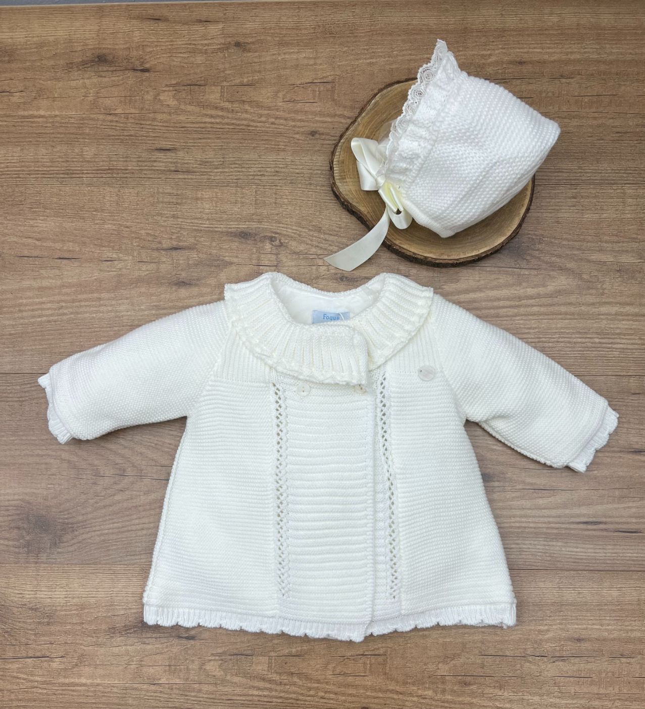 Light beige chubby knit, it is crossed and the inside is fine hair. It has a hood with a valenncie lace trim.