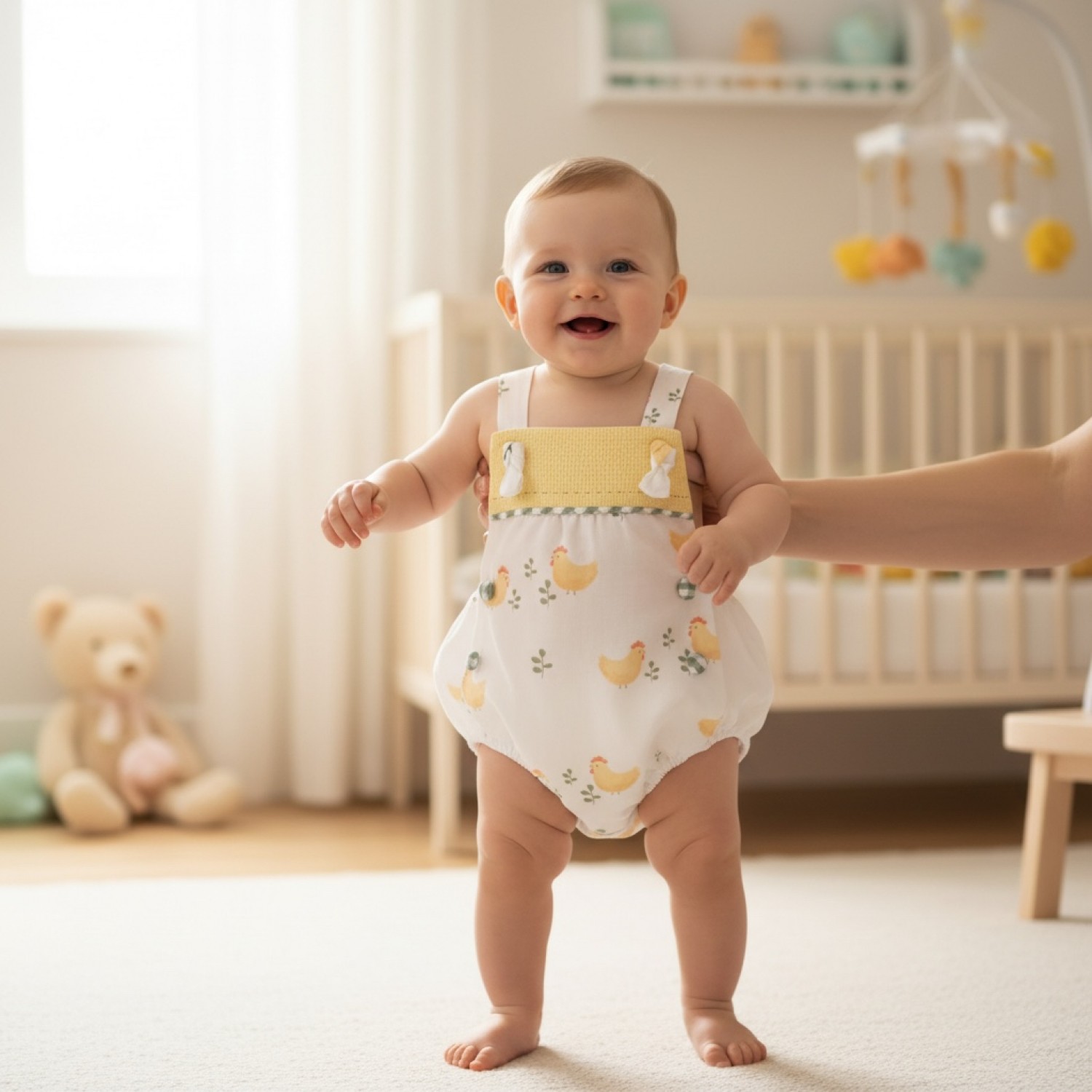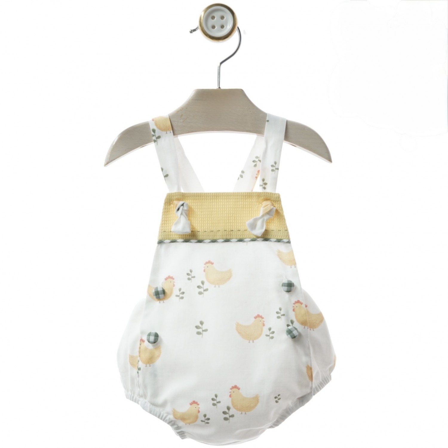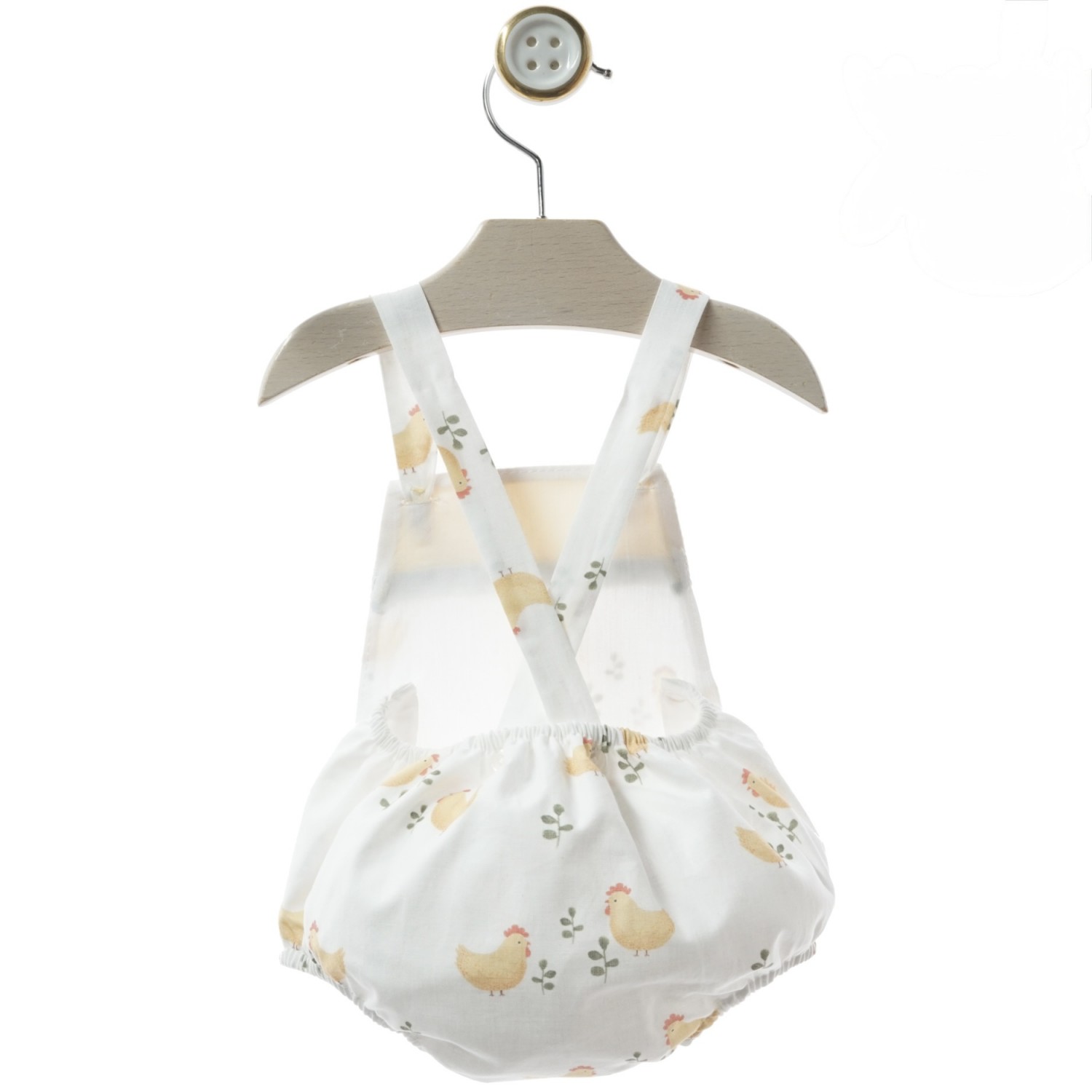 Unisex romper made from lightweight fabric with a delicate print of hens and nature motifs in the soft tones characteristic of the Ánfora collection.