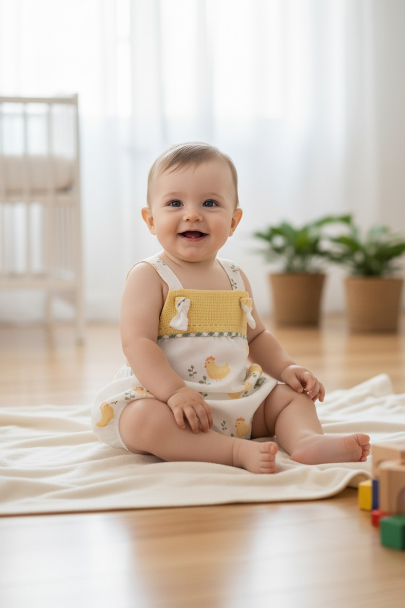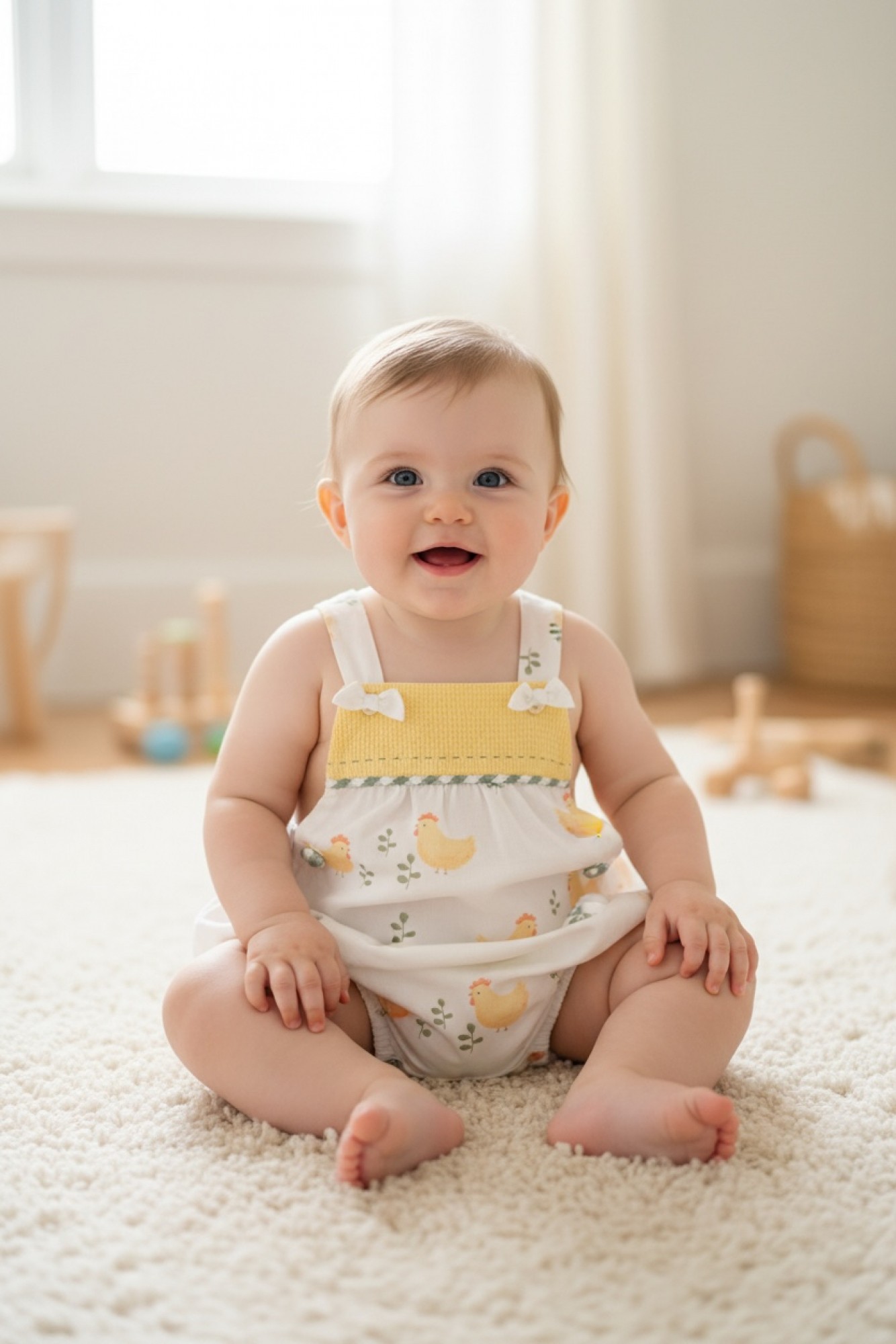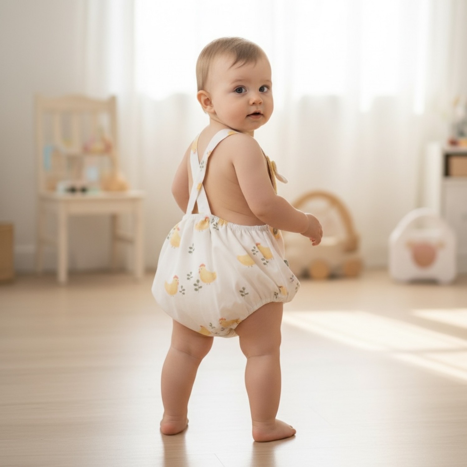 Unisex romper made from lightweight fabric with a delicate print of hens and nature motifs in the soft tones characteristic of the Ánfora collection.