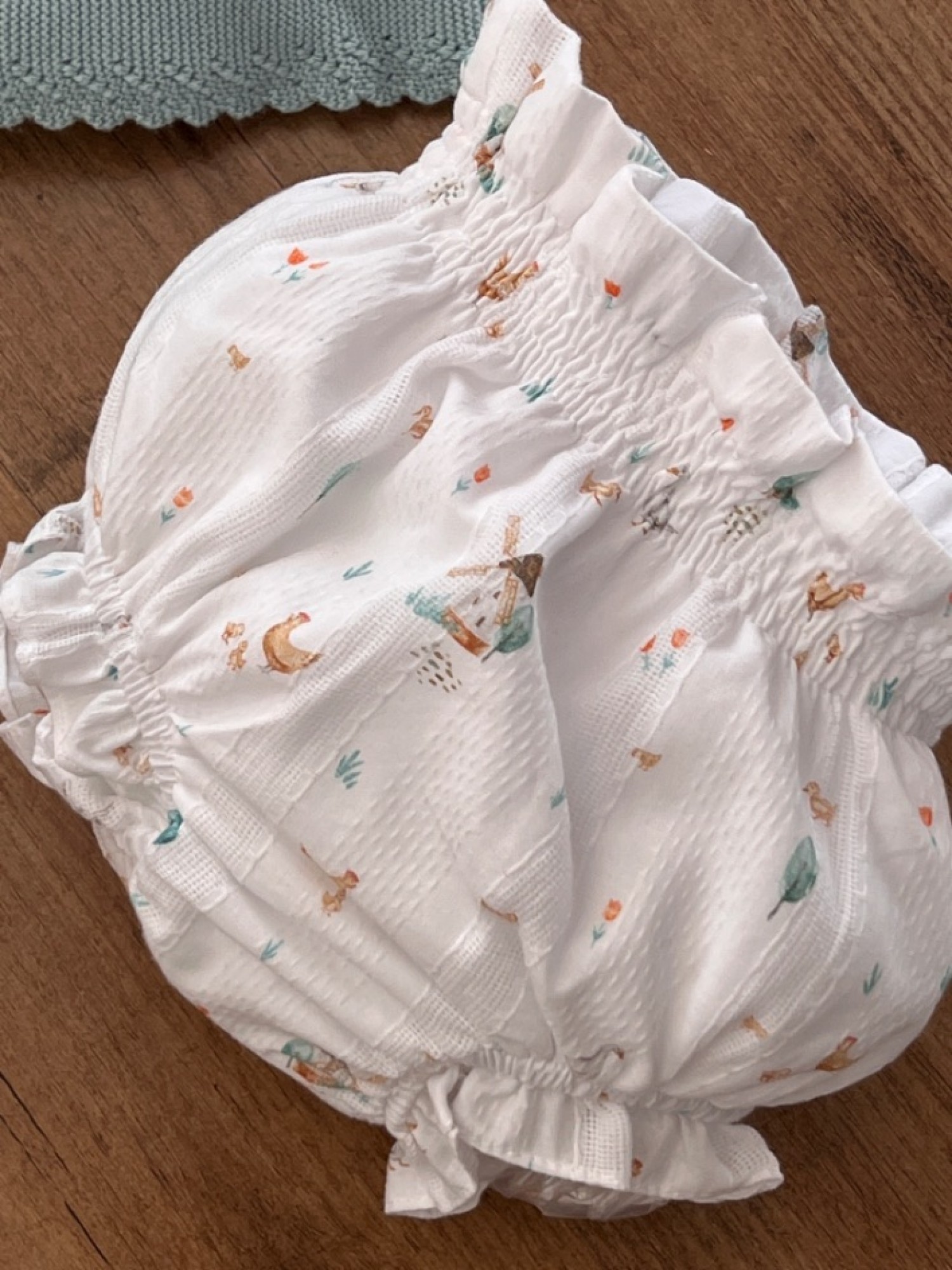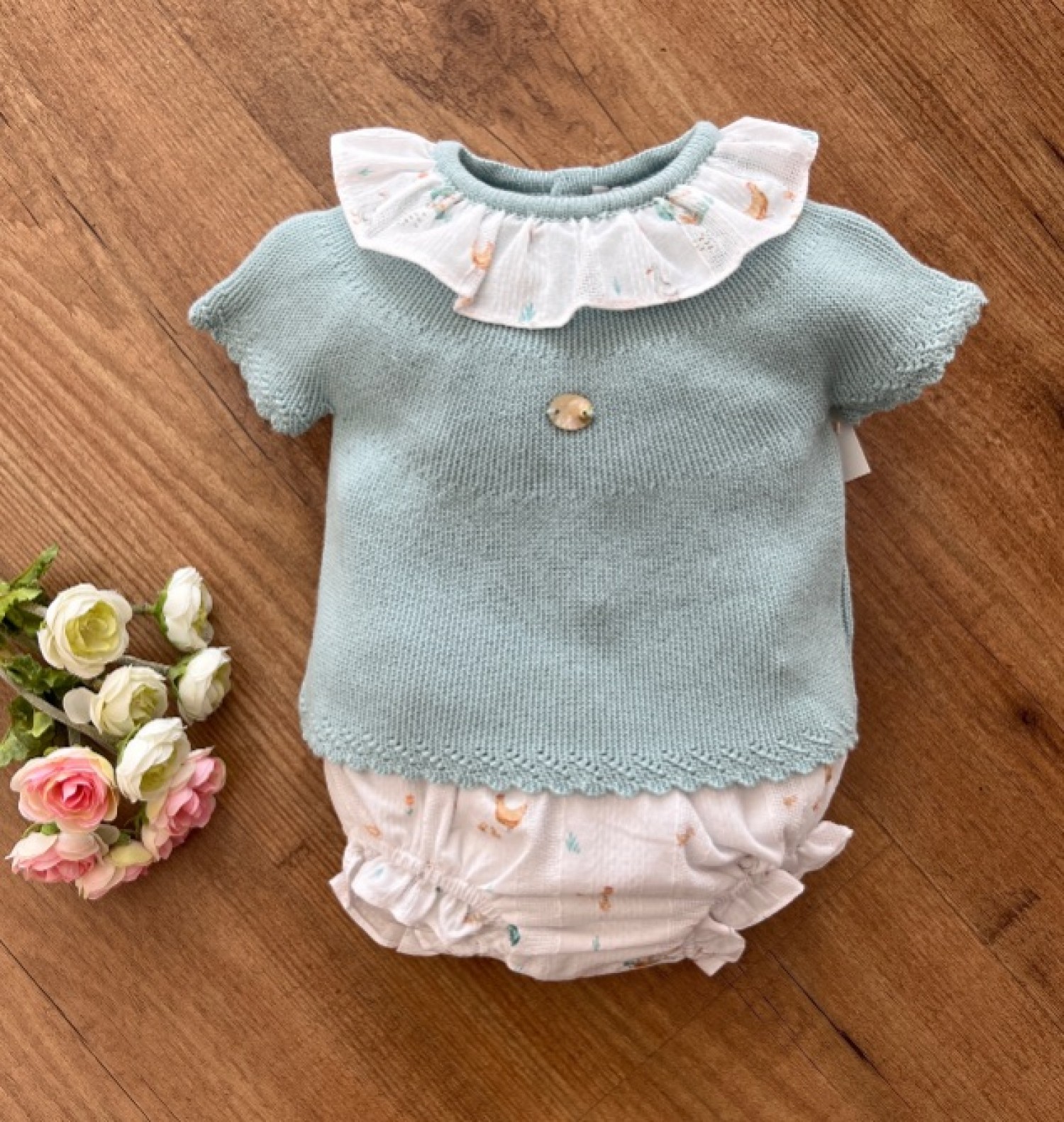 Aqua green 100 x 100 cotton knit jumper with ruffled neckline in the same pattern as the panties.