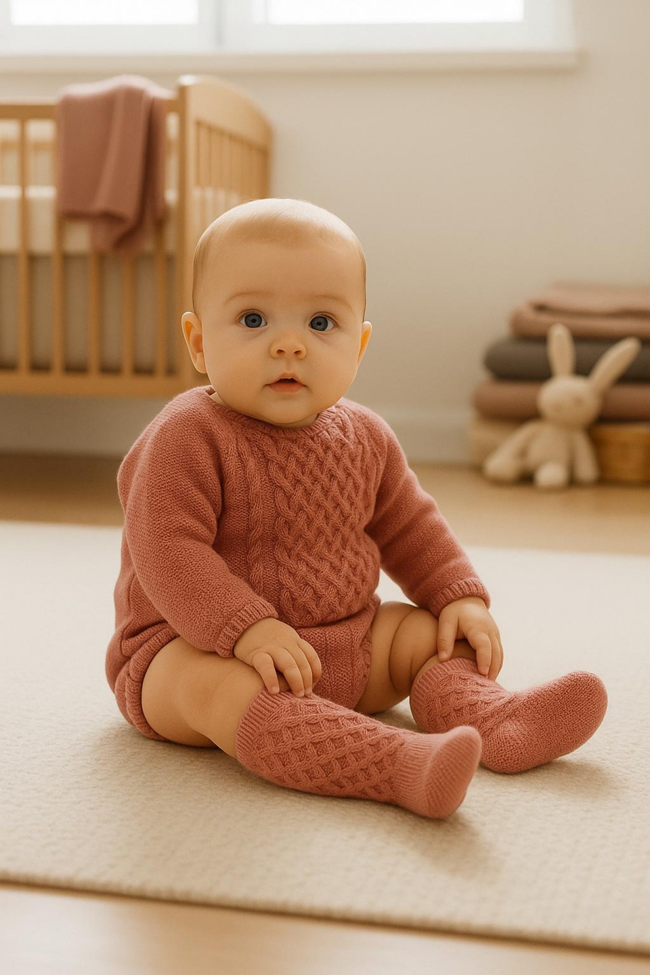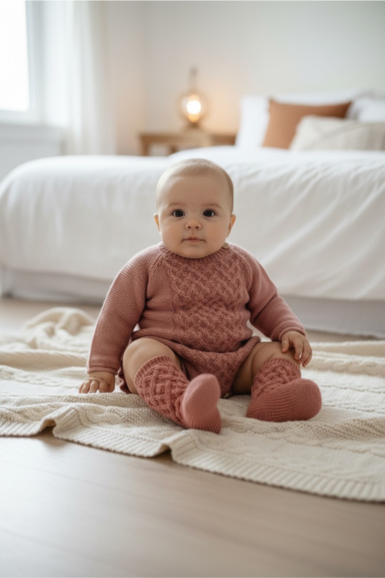 Knit romper in a boiler suit with a raised central pattern and long sleeves.